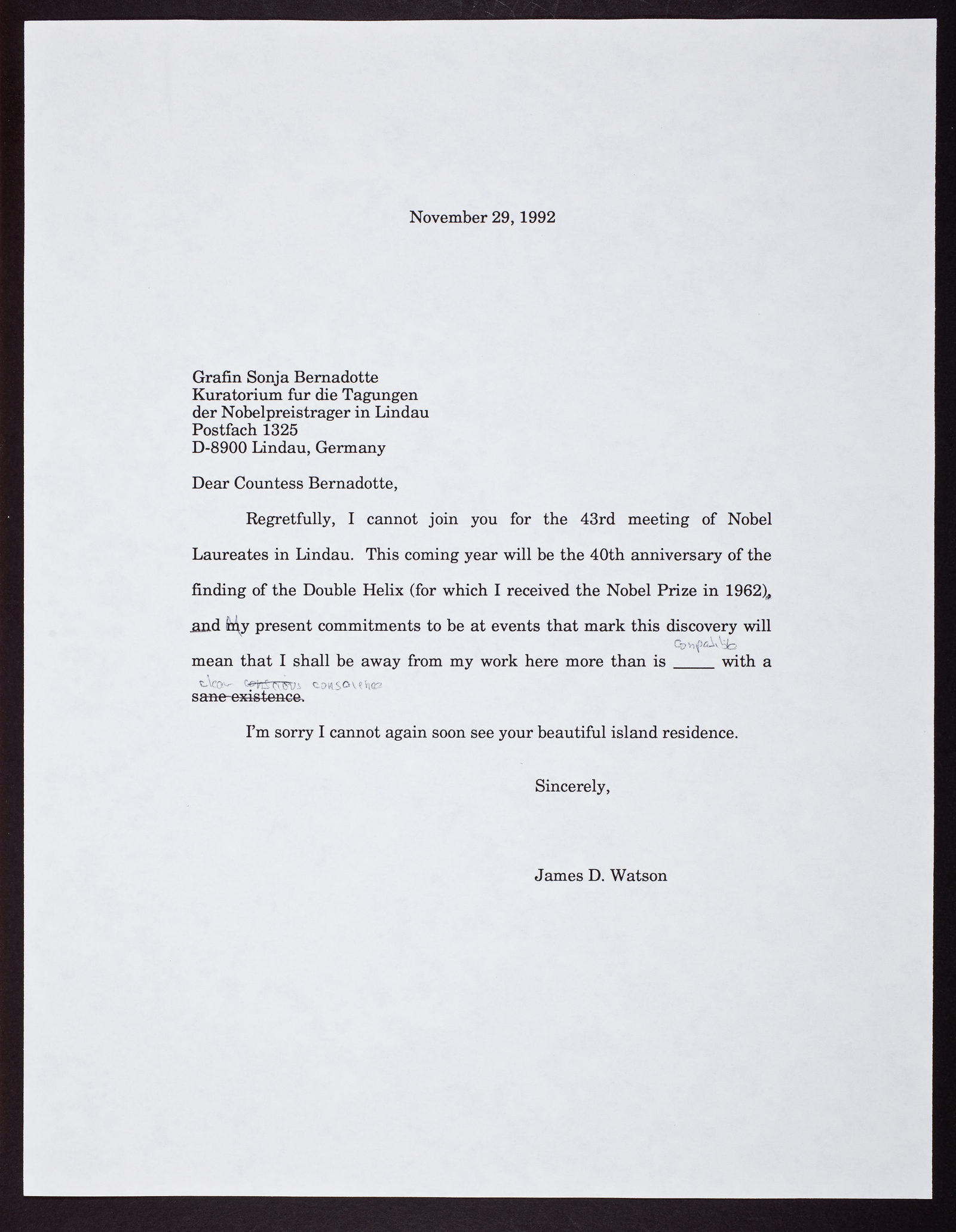 Letter from James D. Watson to Grafin Sonja Bernadotte