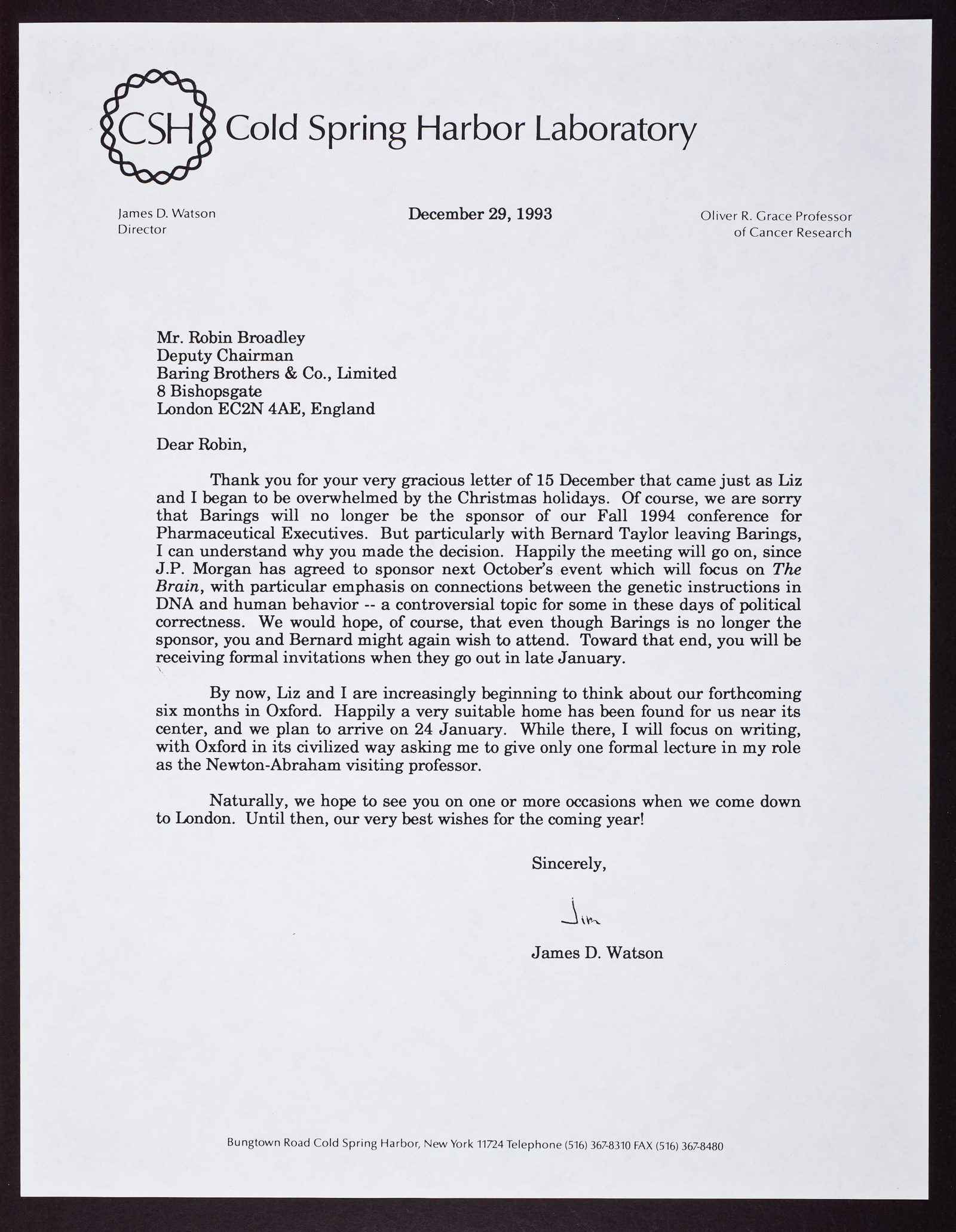 Letter from James D. Watson to Robin Broadley of Baring Brothers and Company