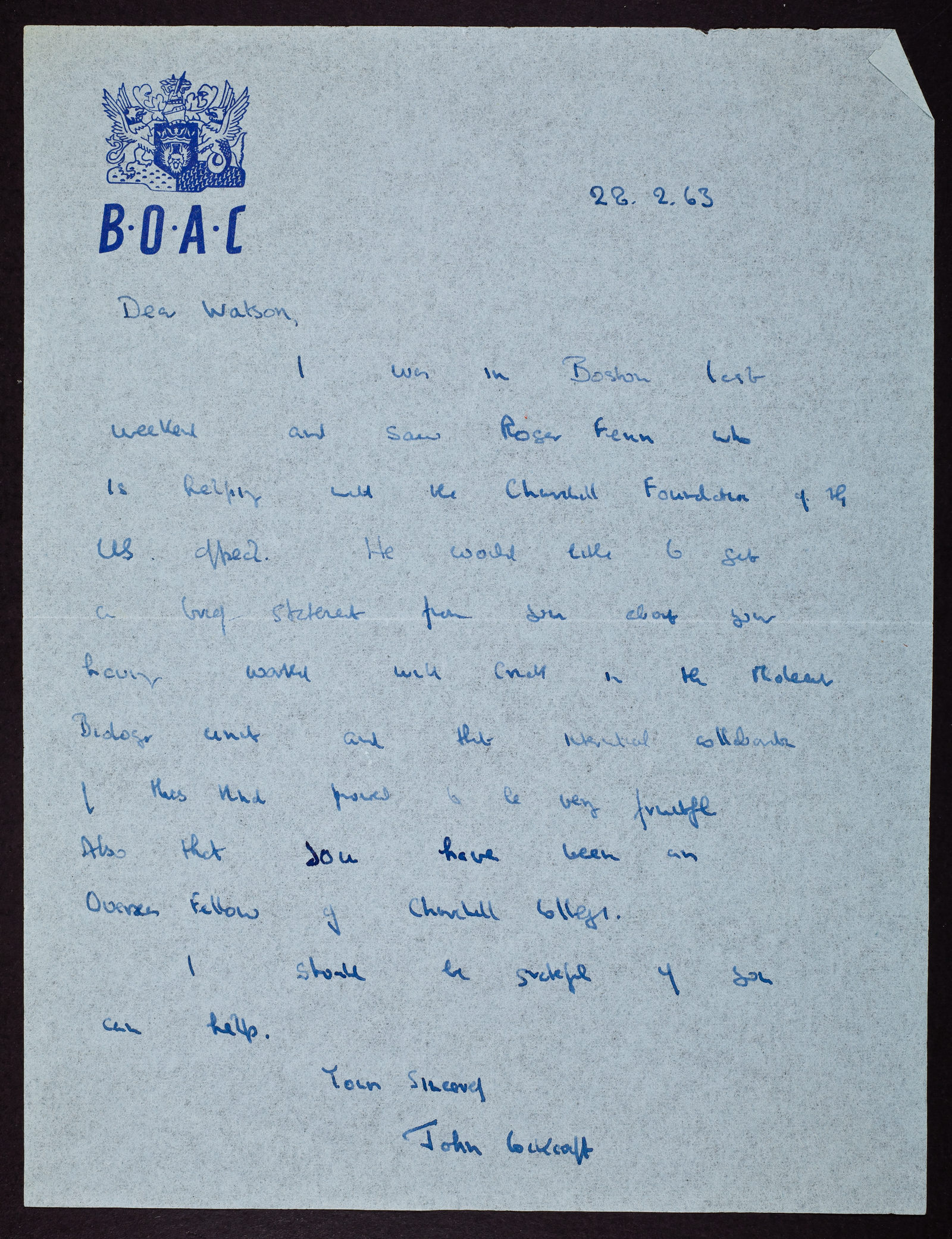 Handwritten letter from Sir John Cockcroft to James D. Watson