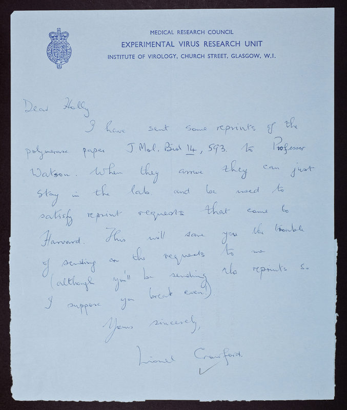 Handwritten letter from Lionel Crawford to Holly Butler, James D. Watson's Secretary