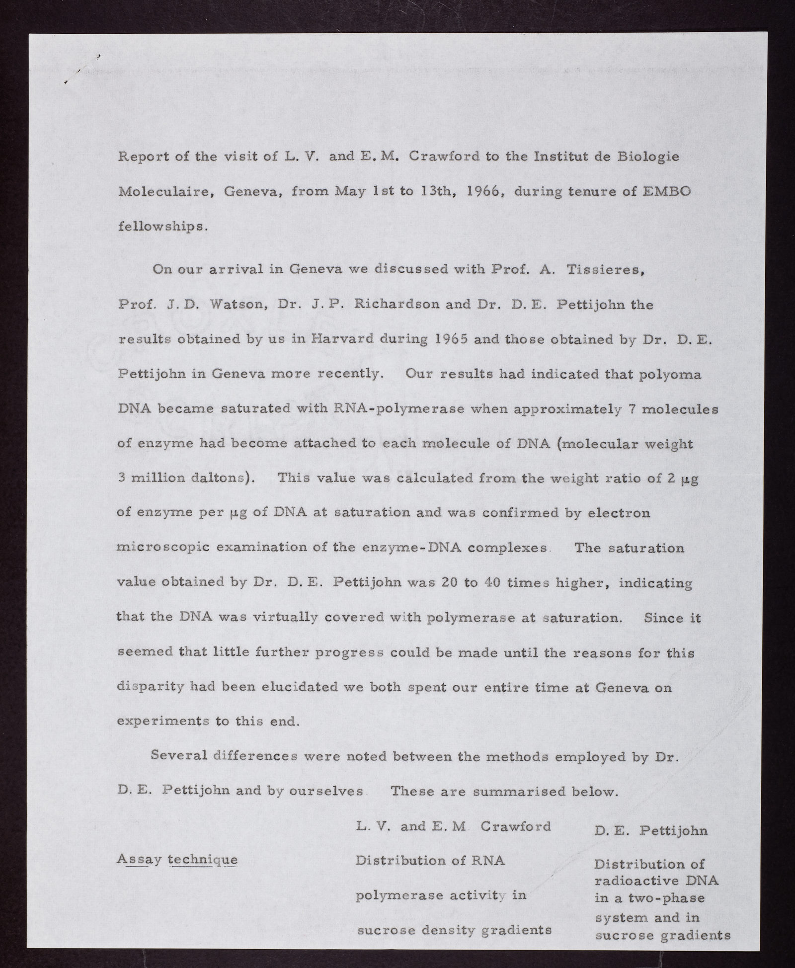 Report of the visit of Lionel Crawford and Elizabeth Crawford to the Institute de Biologie Moelculaire, Geneva