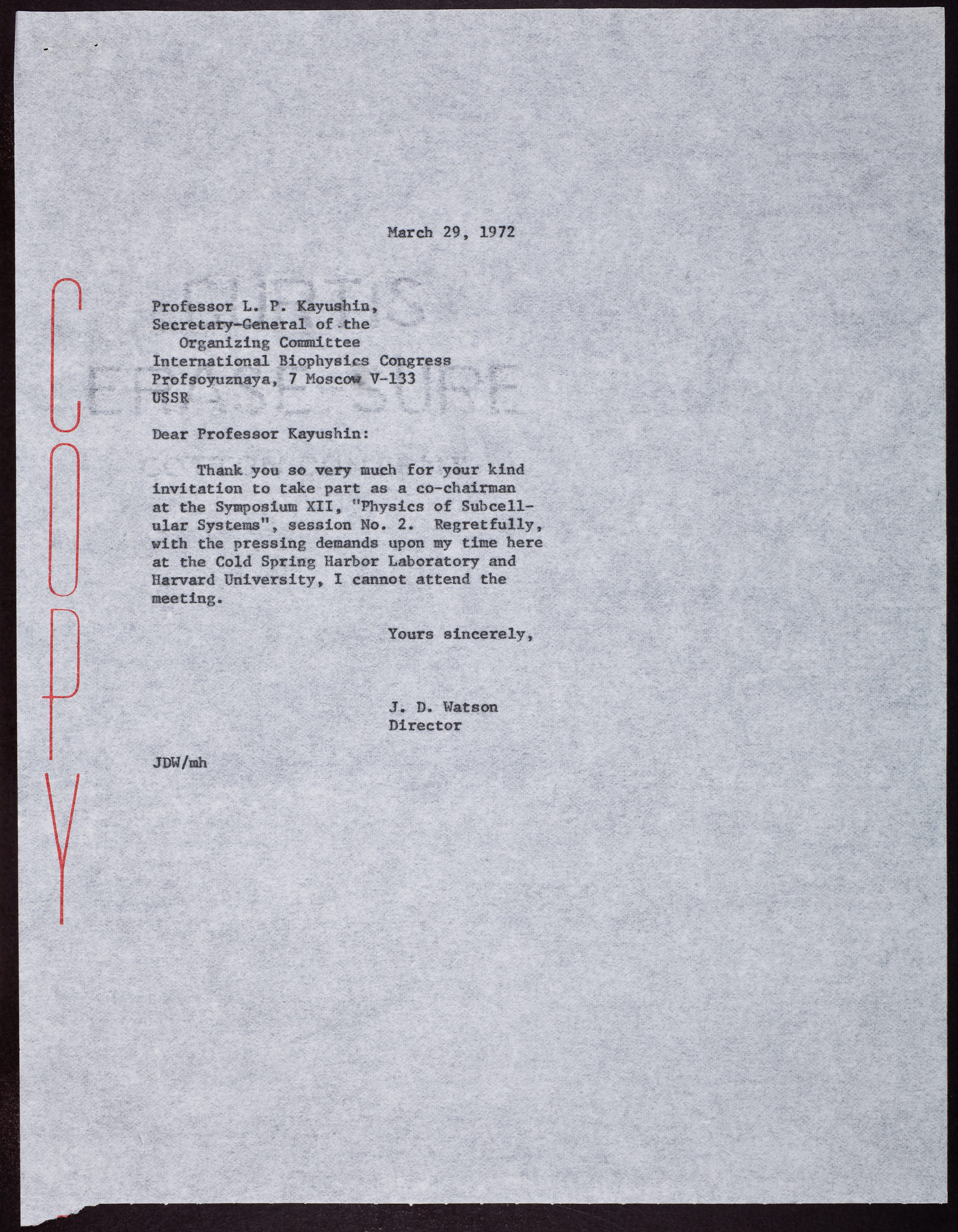 Copy of letter from James D. Watson to L.P. Kayushin