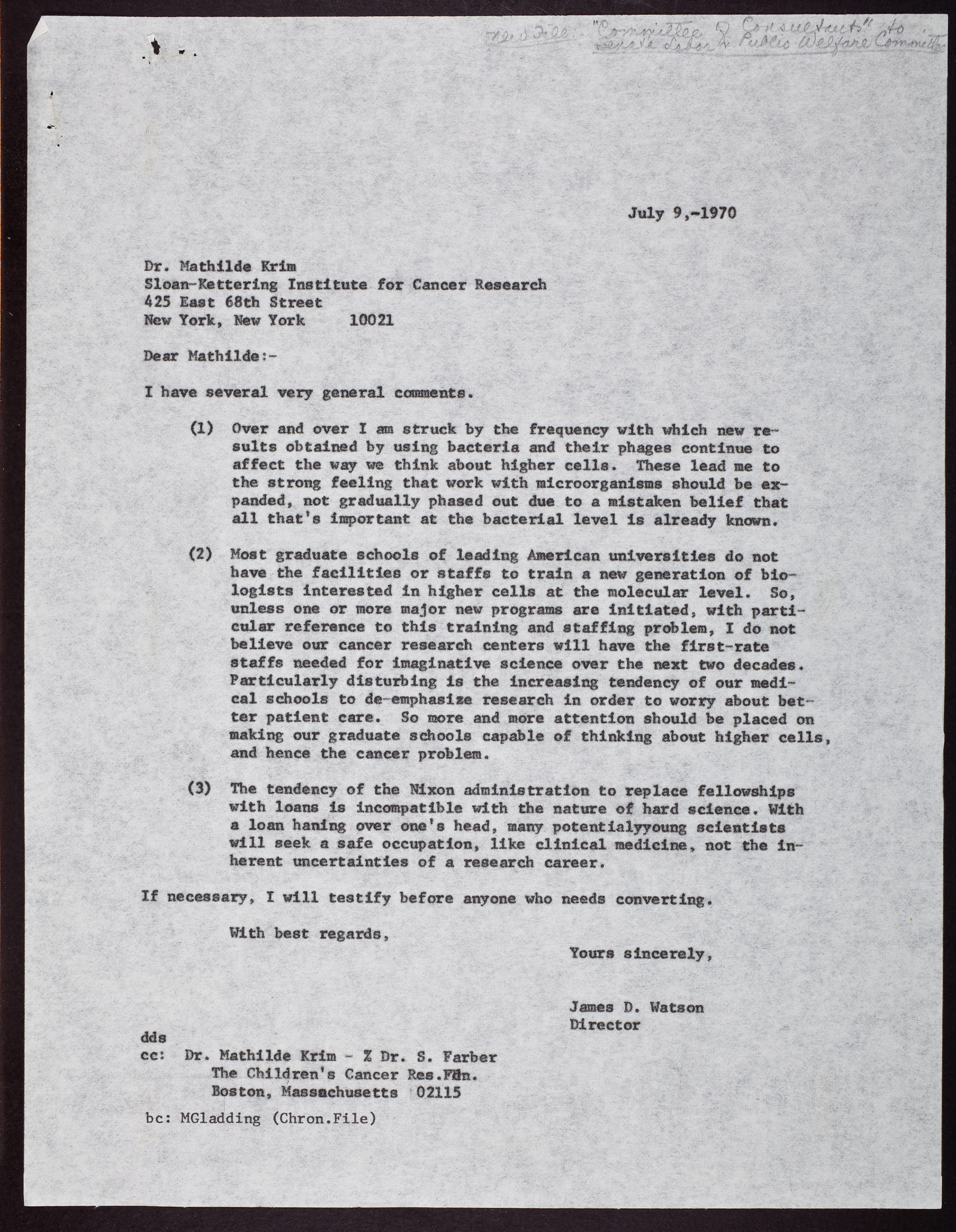 Letter from James D. Watson to Mathilde Krim