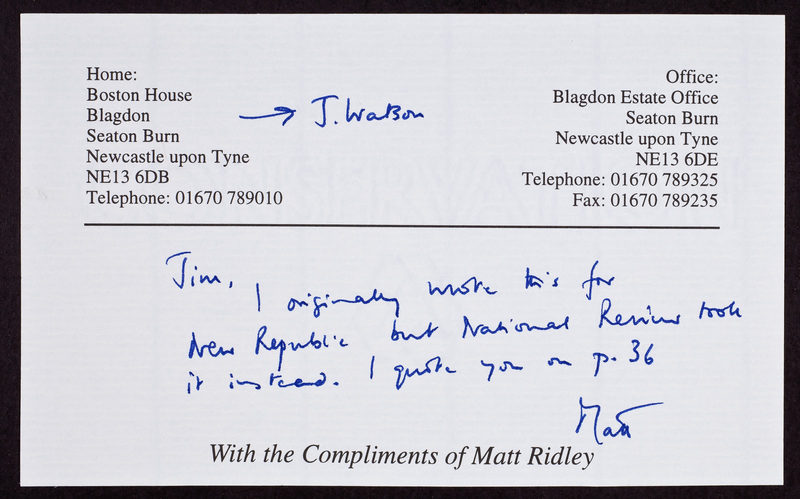 Handwritten note from Matthew Ridley to James D. Watson