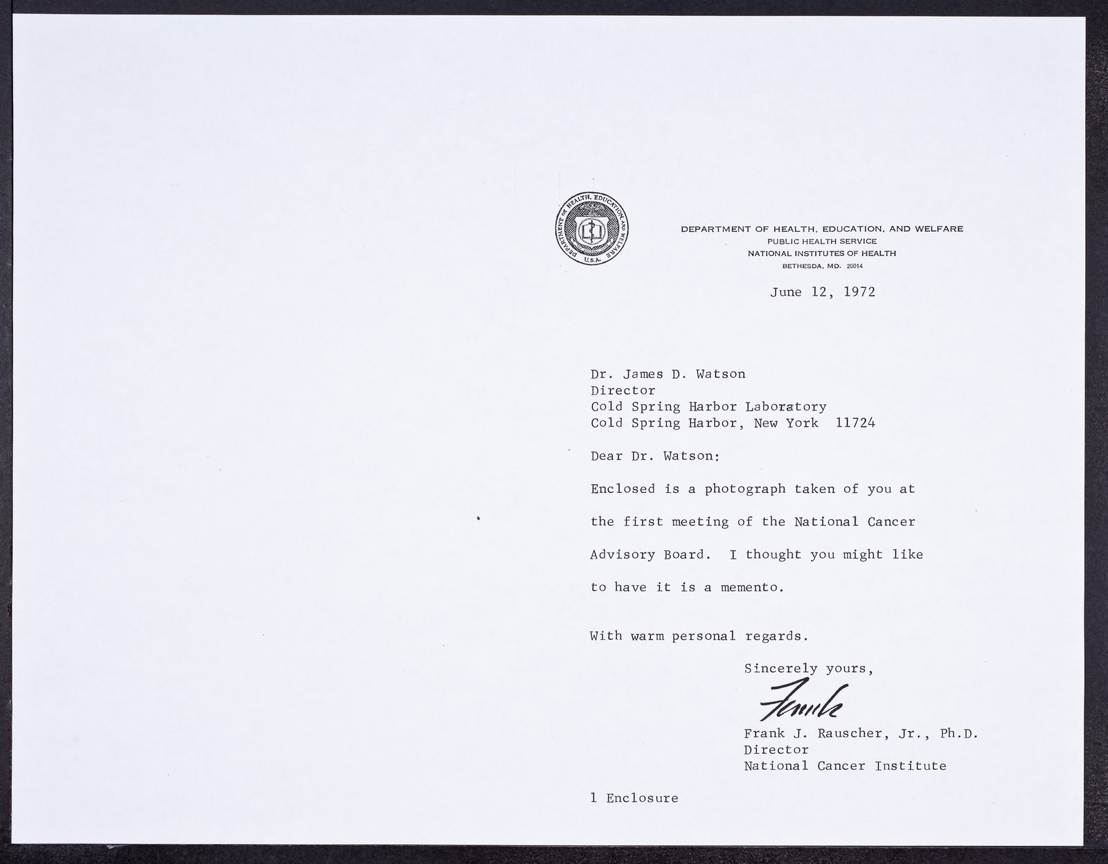 First Meeting of the National Cancer Advisory Board. Includes Watson, Mary Lasker, and a letter from Frank J. Rauscher.