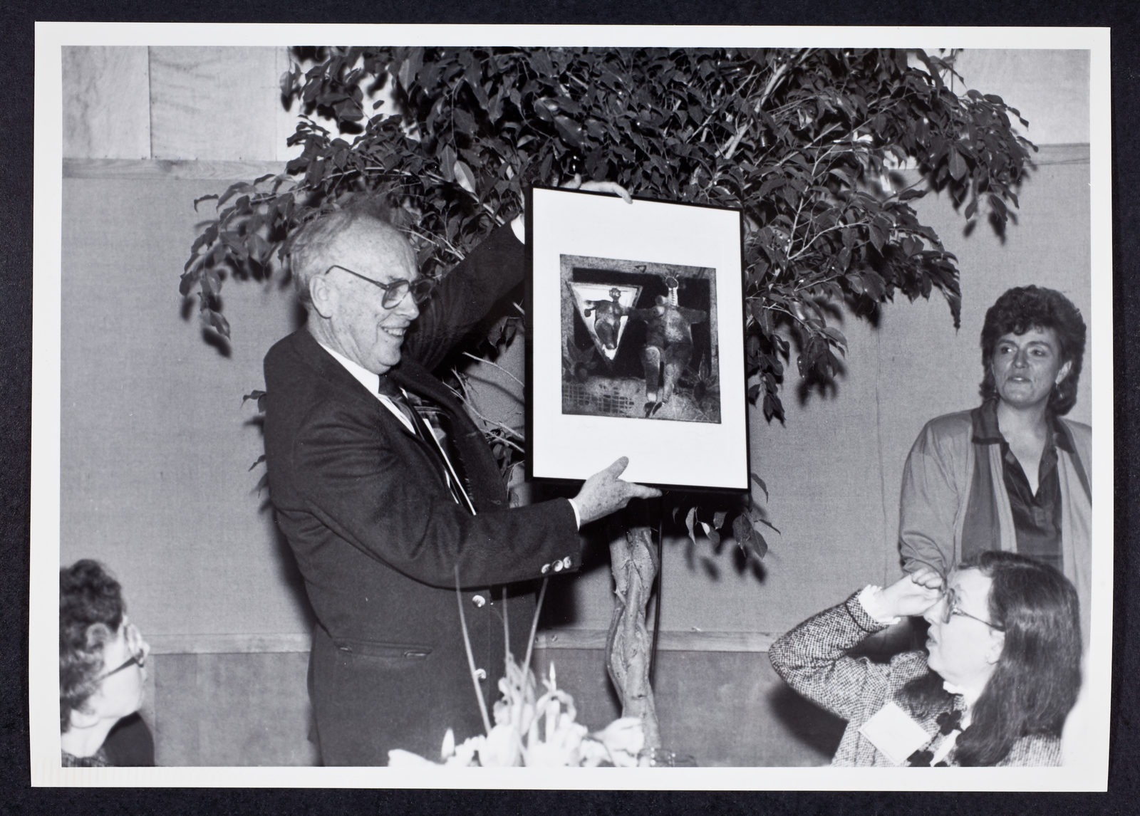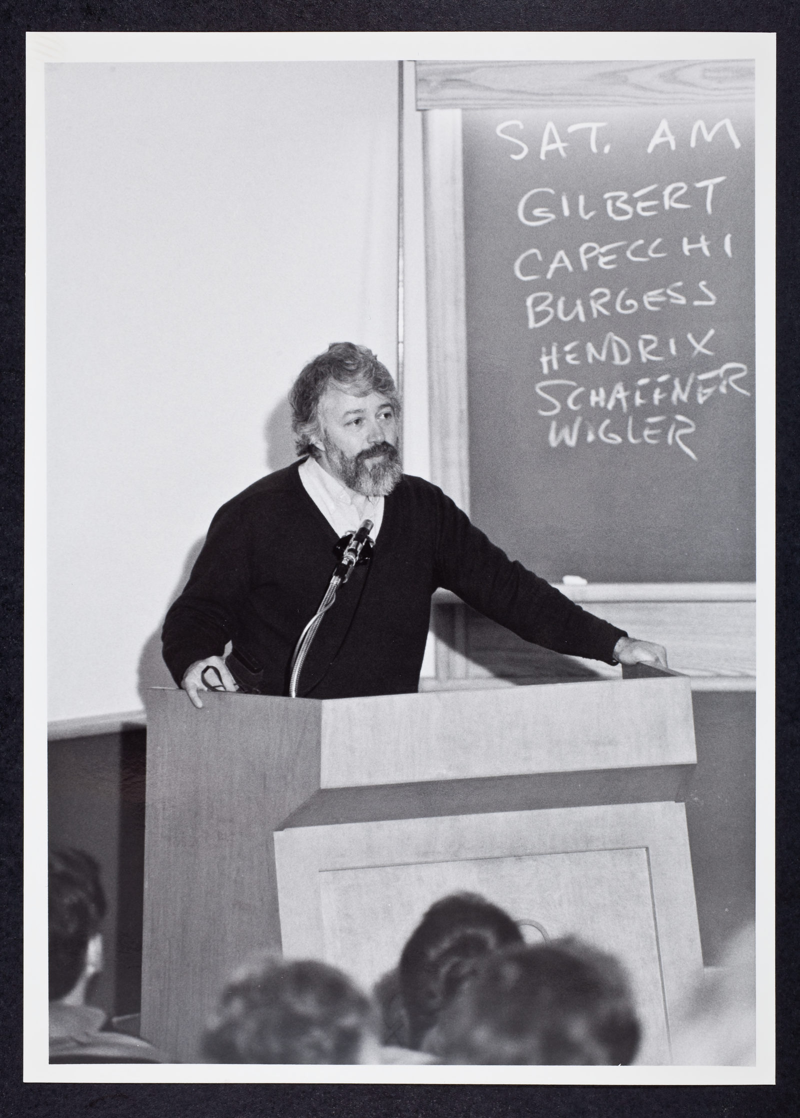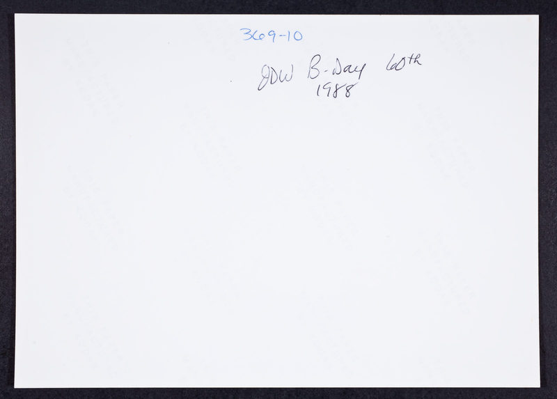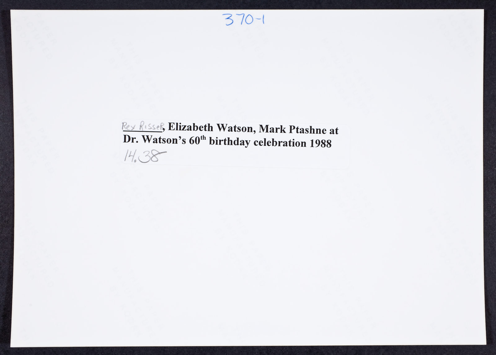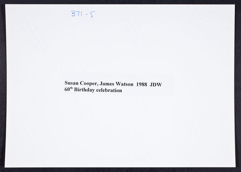 James D. Watson's 60th Birthday Celebration, includes: Walter Gilbert, Mario Capecchi, Gary Gussin, Michael Wigler, Elizabeth L. Watson, Mark Ptashne, Rex Risser, Alfred Tissieres, Susan Cooper, and group photographs.