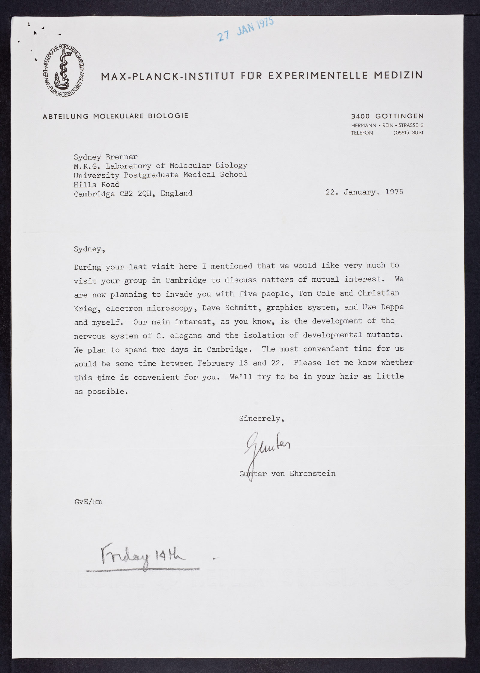 Letter from Gunter Von Ehrenstein to Sydney Brenner