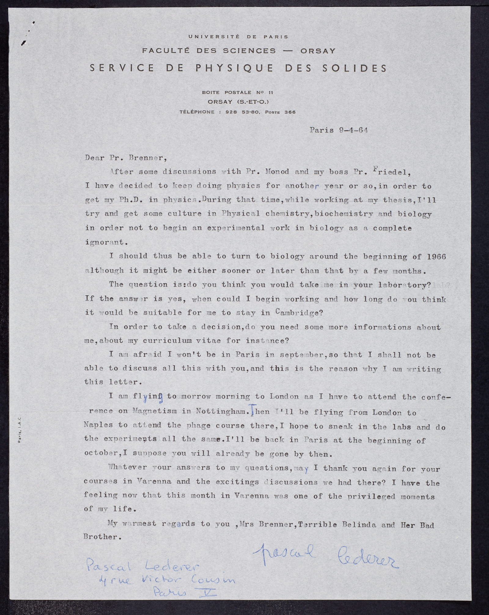 Letter from Pascal Lederer to Sydney Brenner