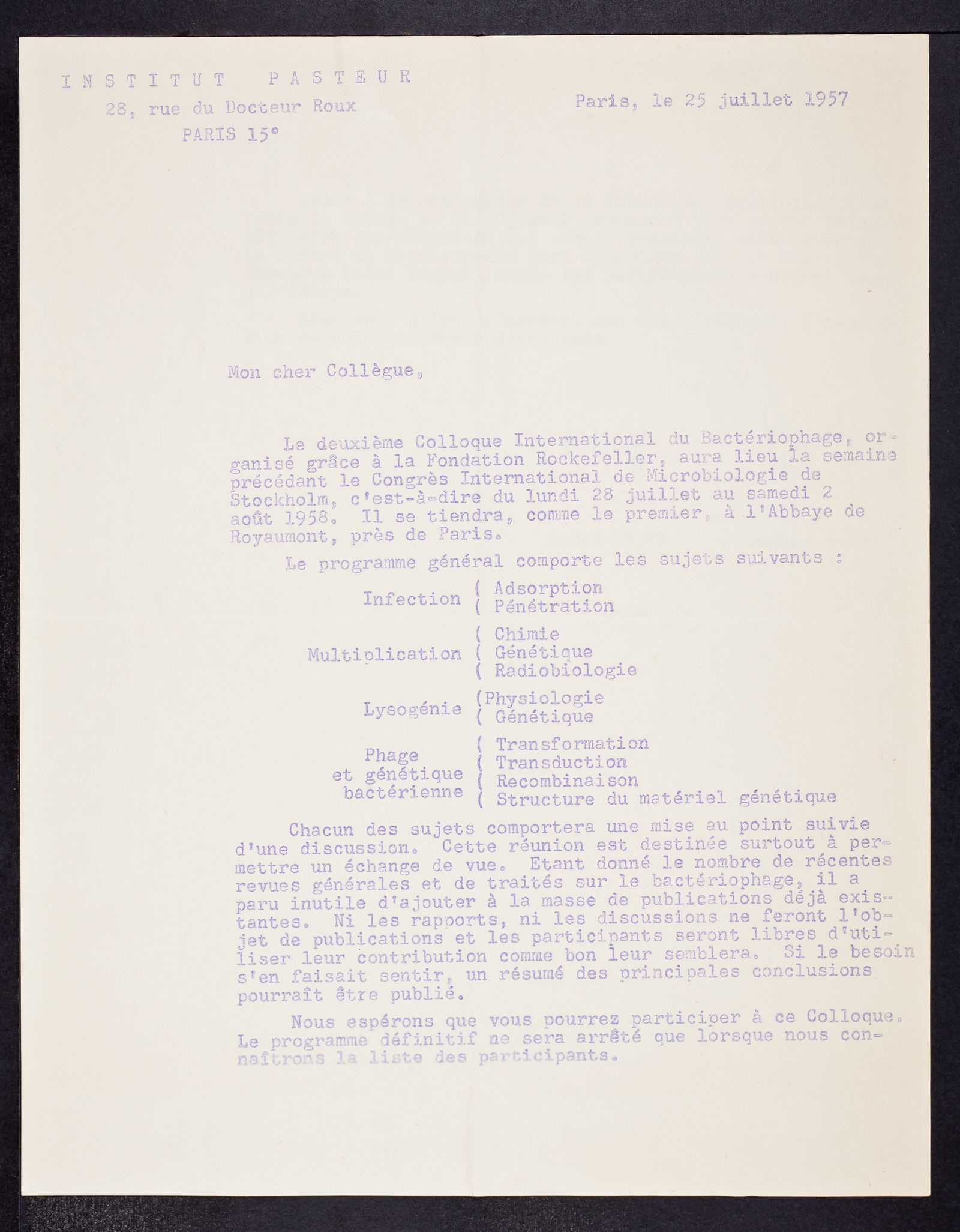 Letter from Andre Lwoff and Francois Jacob to Sydney Brenner