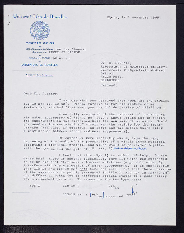 Letter from Rene Thomas to Sydney Brenner