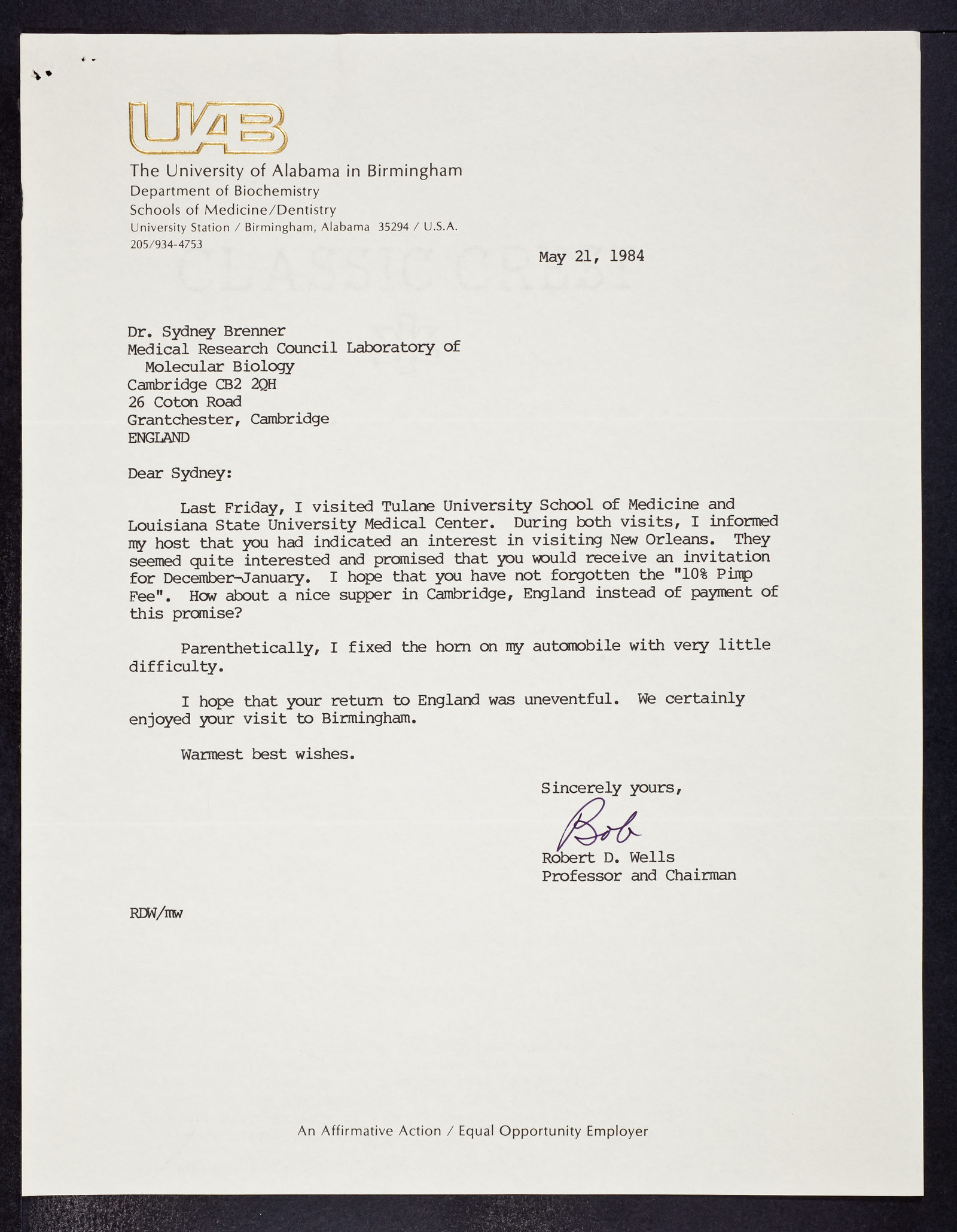 Letter from Robert D. Wells to Sydney Brenner