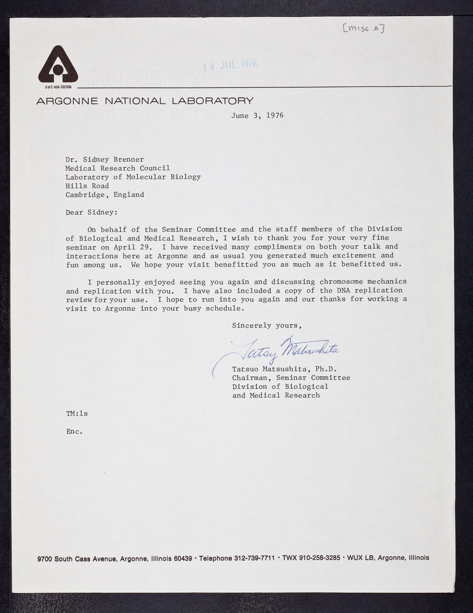 Letter from Tatsuo Matsushita to Sydney Brenner