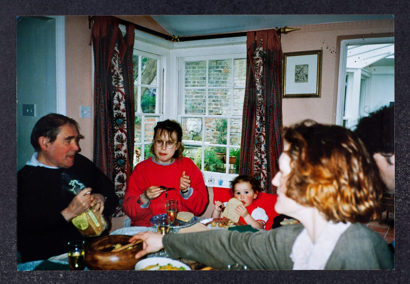 [Handwritten on verso of photograph:] Sydney Brenner, Carla Brenner, Chloe Miller[?] (Amanda's 1/2 sister) and a friend Lunch 9-5-93. ELY.