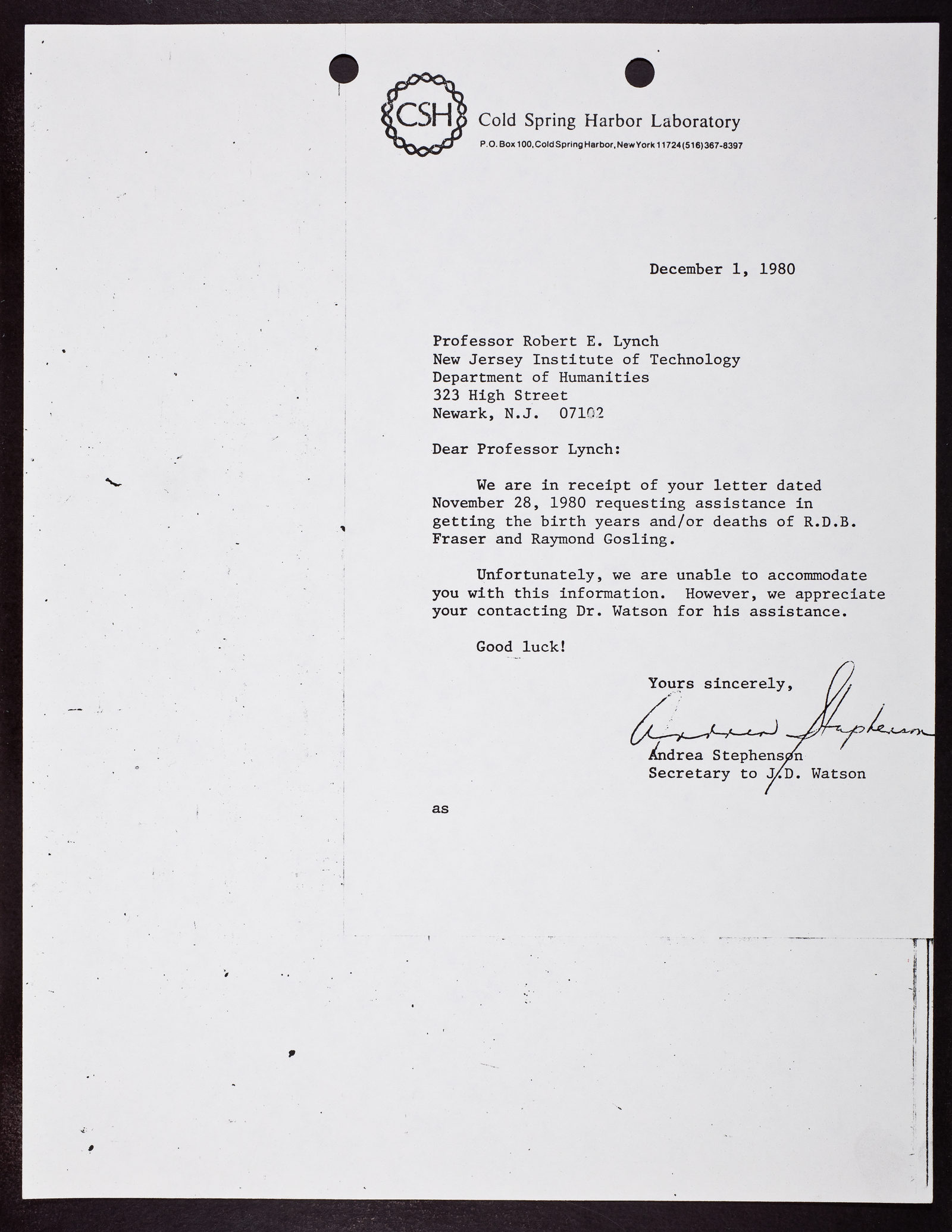 Letter from Andrea Stephenson, James D. Watson's Secretary, to Robert E. Lynch
