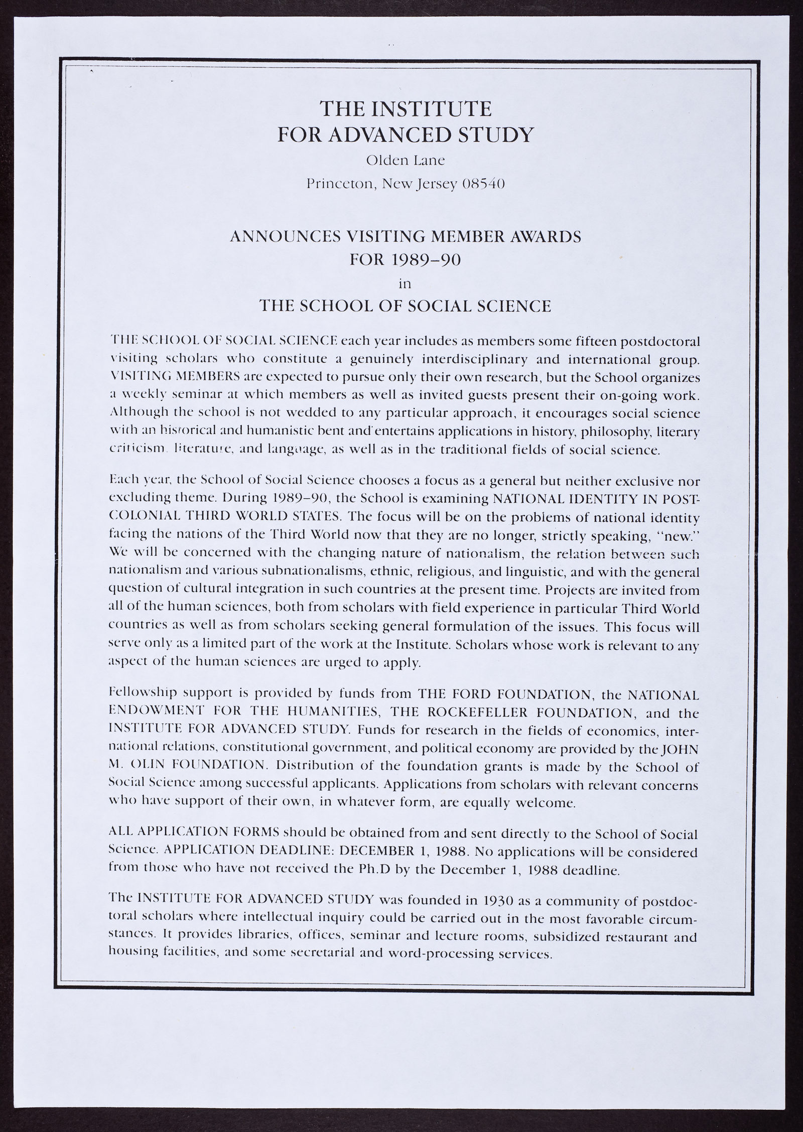 The Institute for Advanced Study - Announces Visiting Member Awards for 1989-90 in the School of Social Science