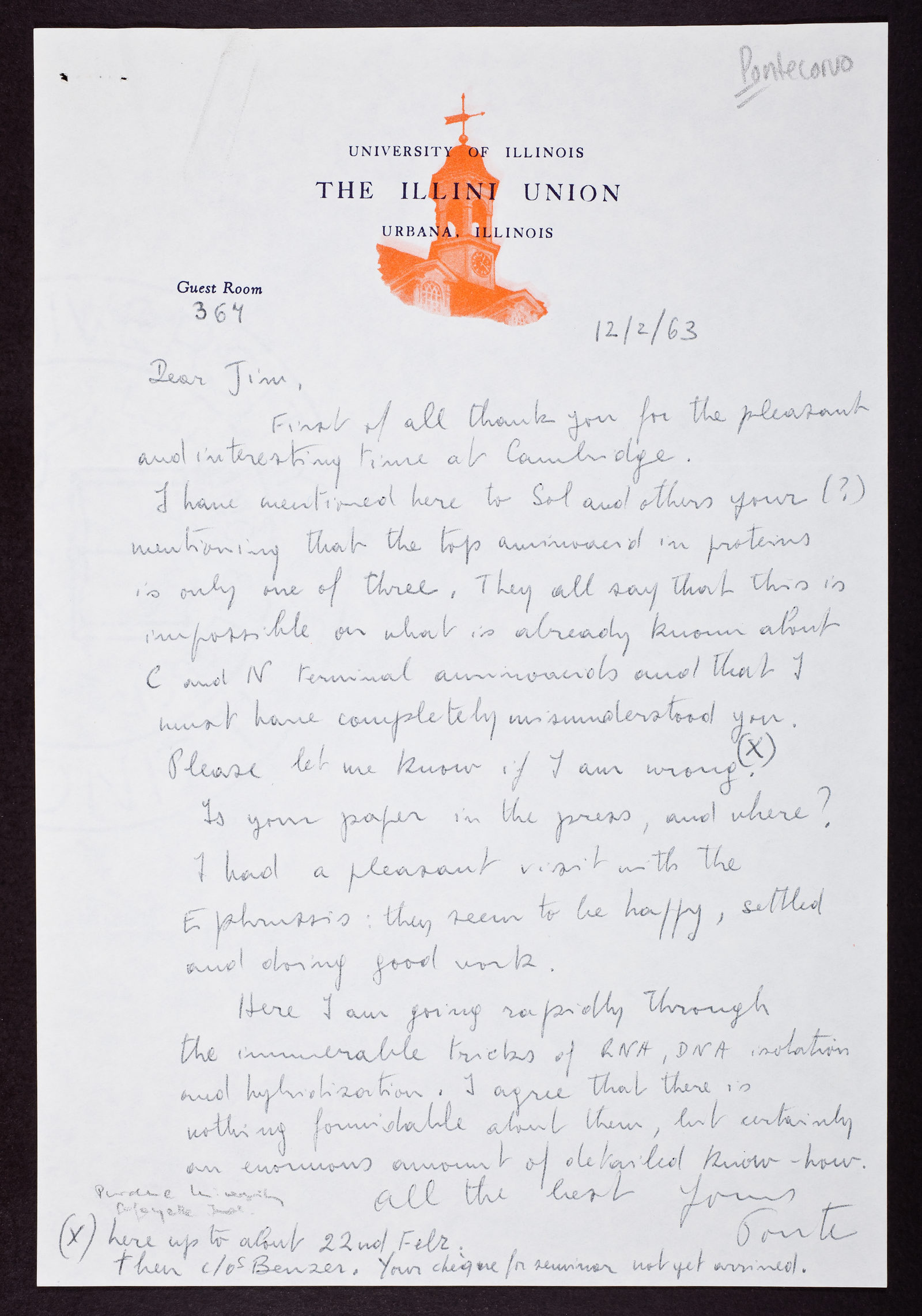 Handwritten letter from Guido Pontecorvo to James D. Watson