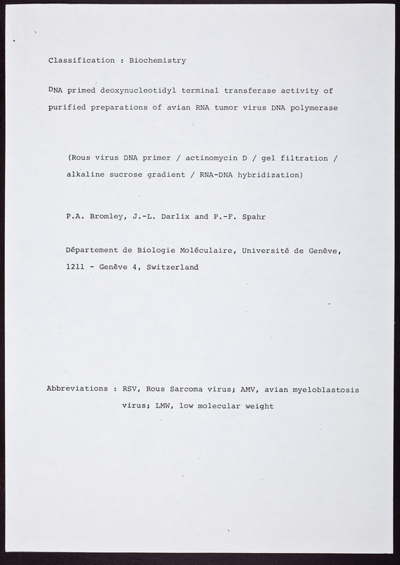 Typescript: "DNA primed deoxynucleotidyl terminal transferase activity of purified preparations of avian RNA tumor virus DNA polymerase" by P.A. Bromley, J.-L. Darlix and P.-F. Spahr