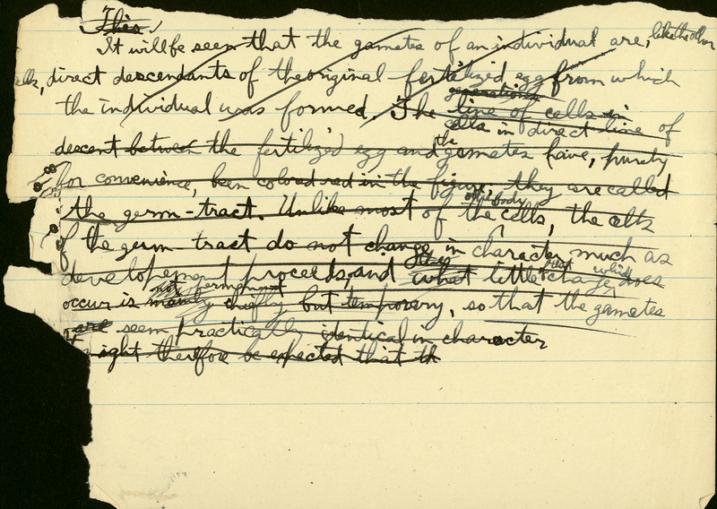 Handwritten notebooks and loose pages for a planned genetics text by Hermann J. Muller and Edgar Altenberg while in graduate school at Columbia University, 1912, which was unpublished. "This is the original notebook of Muller's... for the projected text with Altenberg ~1913-1914 which they abandoned when Morgan began work on the 'Mechanism of Mendelian Heredity.' Altenberg turned down an invitation to write a chapter but Muller wrote 3 or 4 chapters for Morgan. Muller quoted from this early effort in his 'Collected Works.'" [handwritten by Elof Carlson on folder in archives].
