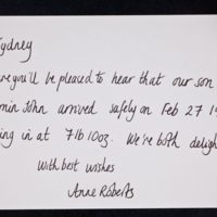Tags: Birth announcements~ Correspondence~ Delbruck, Manny~ Delbruck, Max~ Watson, James D., 1928-