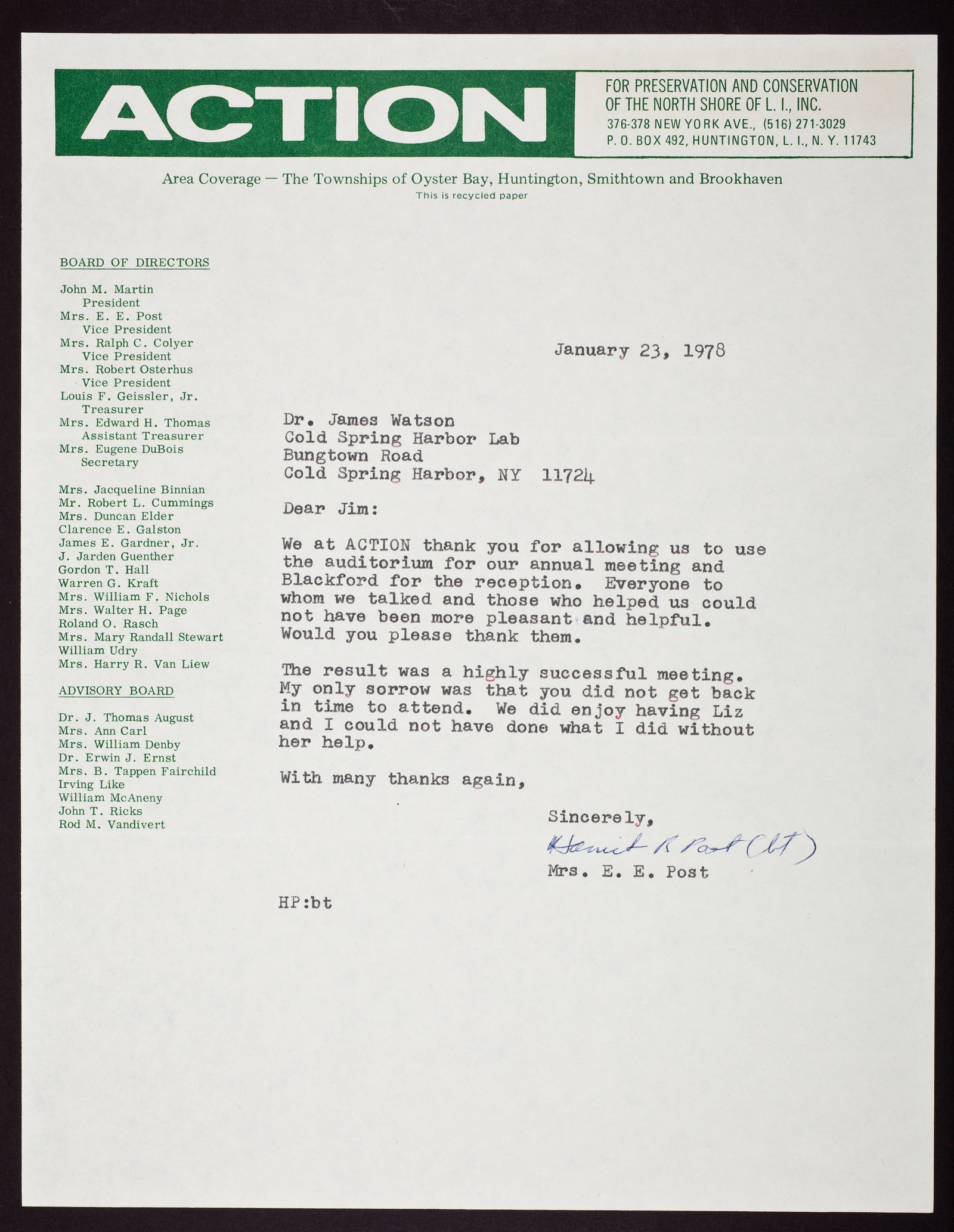 Letter from Mrs. E. E. Post of ACTION for the Preservation and Conservation of the North Shore of Long Island, Inc. to James D. Watson