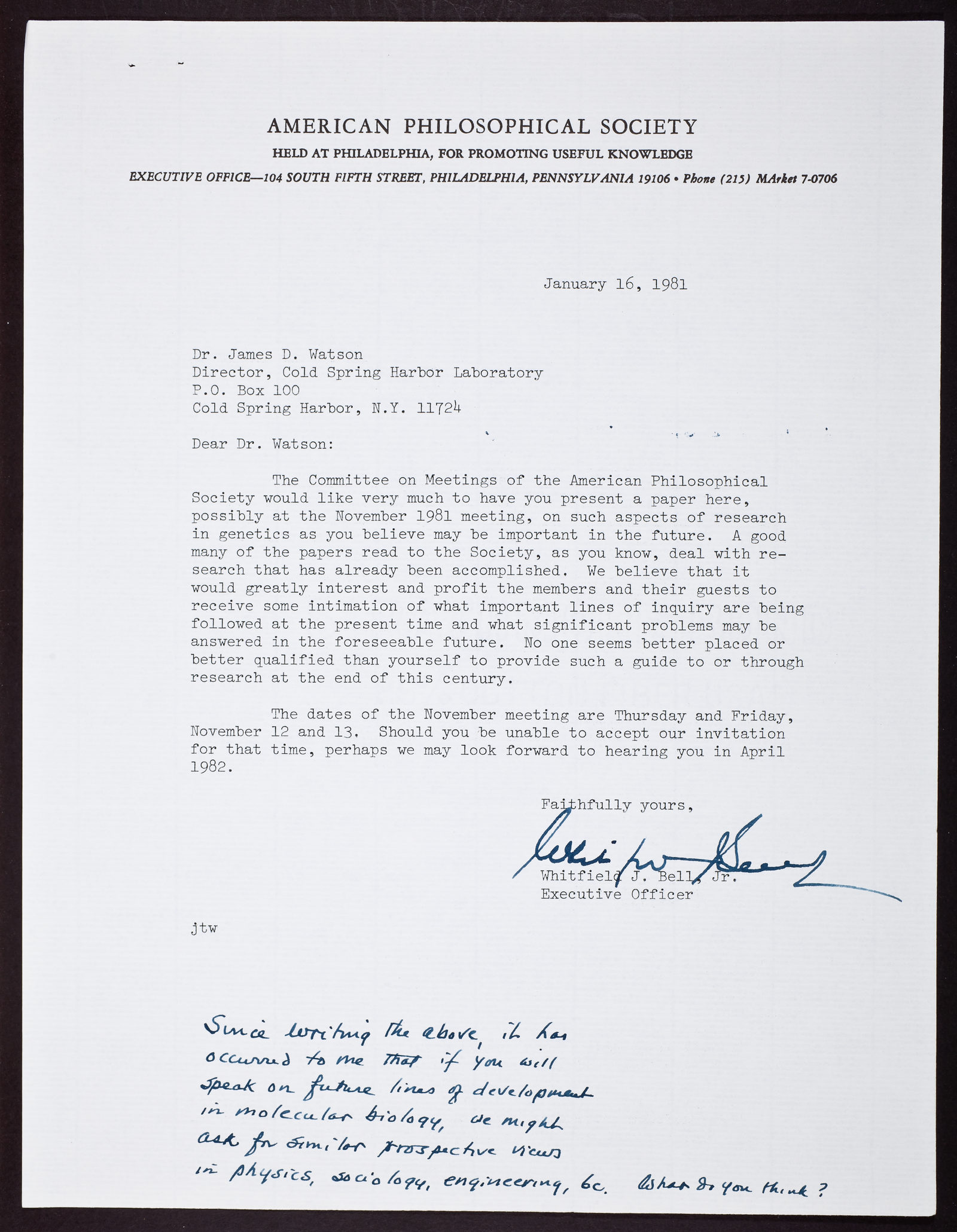 Letter from Whitfield J. Bell, Jr. to James D. Watson