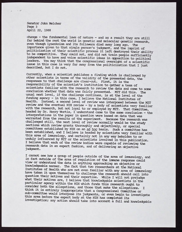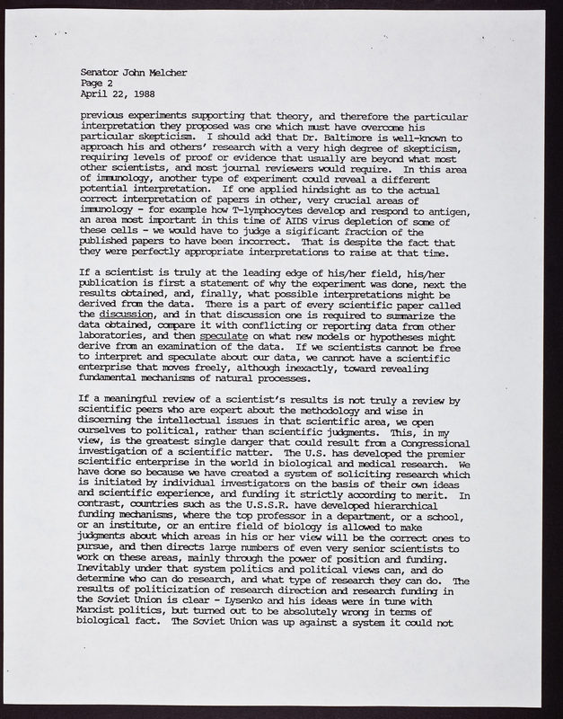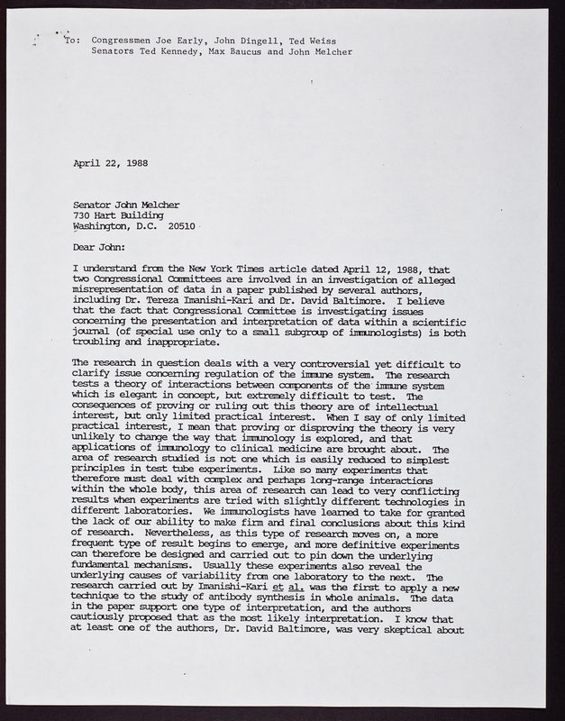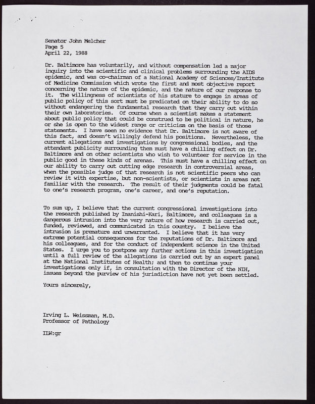 Letter from Irving L. Weissman to Senator John Melcher, regarding David Baltimore