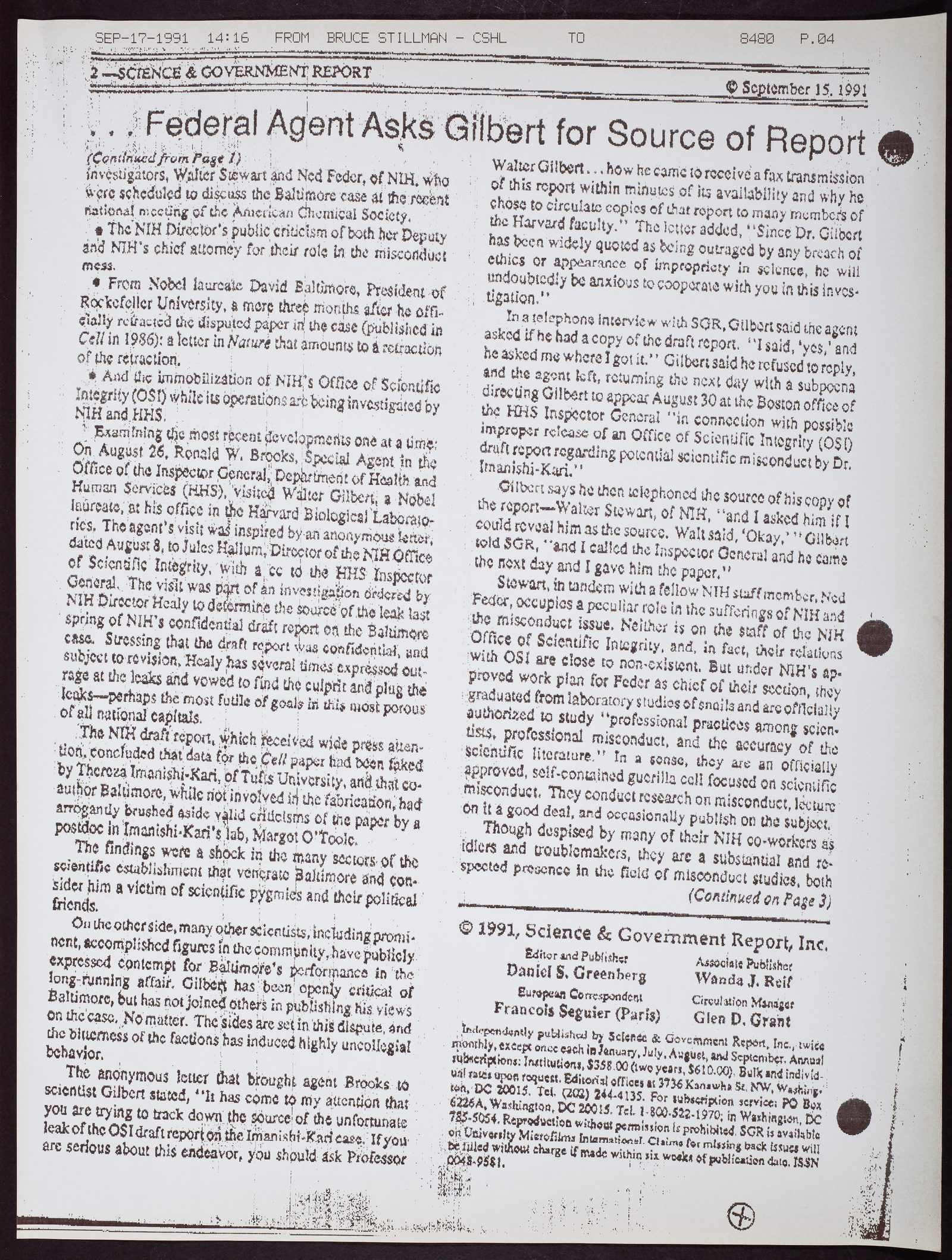 Fax from Jesse Ausubel to James D. Watson regarding David Baltimore Case