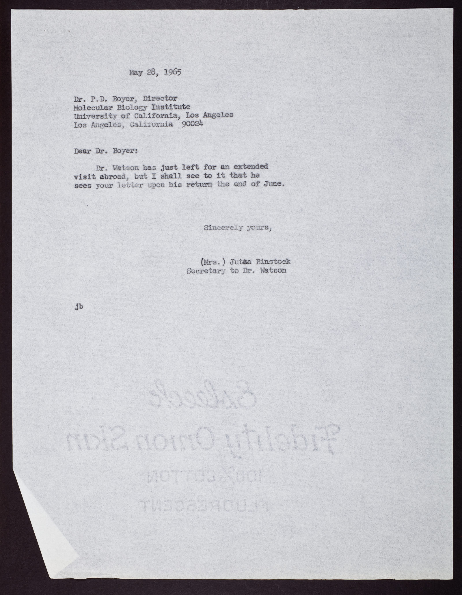 Letter from Mrs. Jutta Binstock, Secretary to James D. Watson, to P. D. Boyer