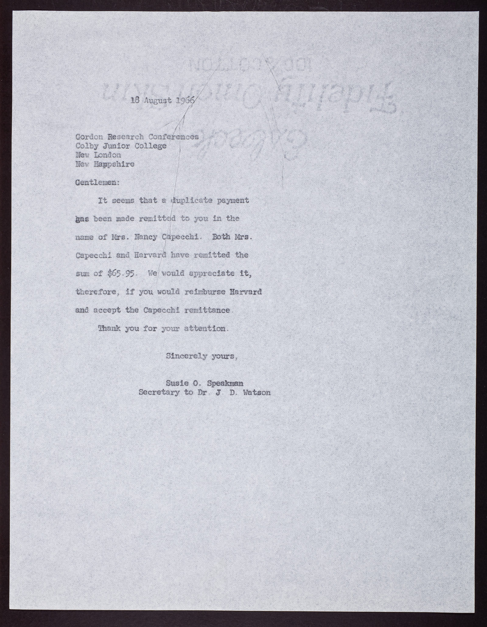 Letter from Susie O. Speakman, Secretary to James D. Watson, to Colby Junior College, regarding Mario R. Capecchi's wife