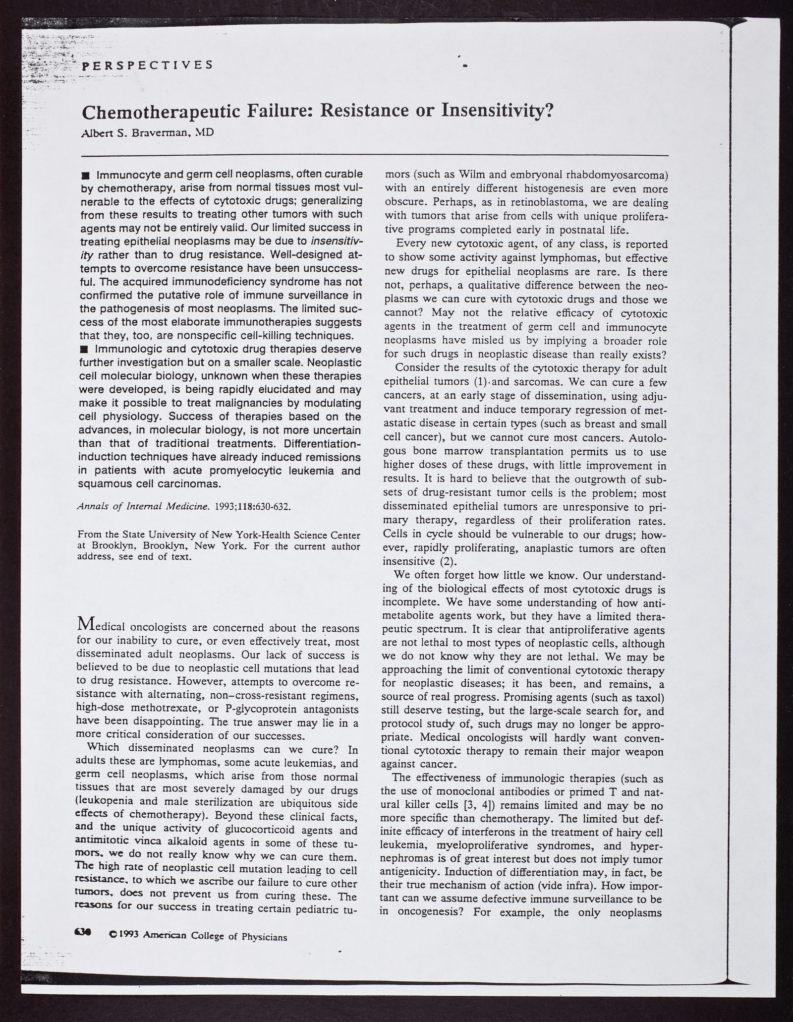 Article: "Chemotherapeutic Failure: Resistance or Insensitivity" by Albert S. Braverman