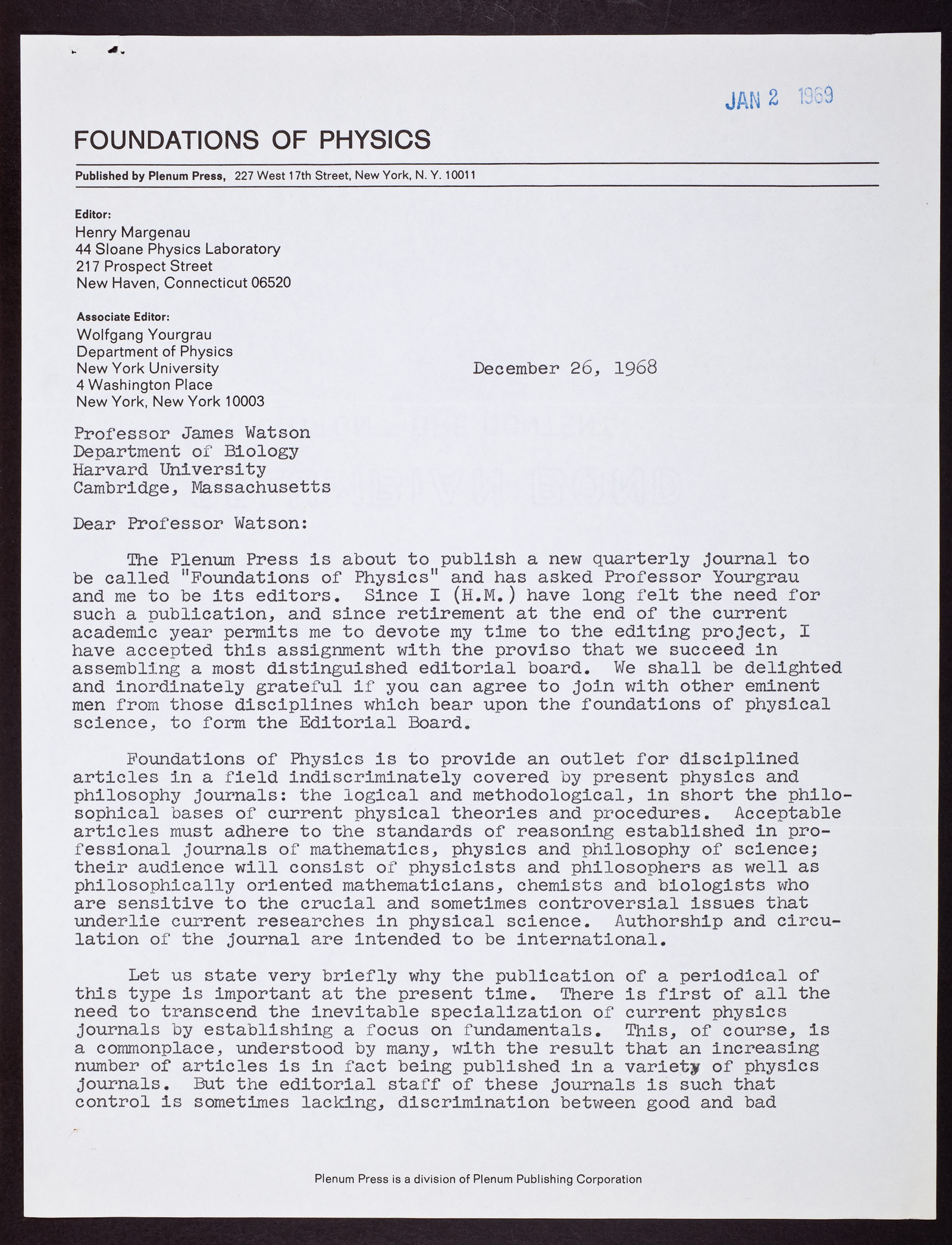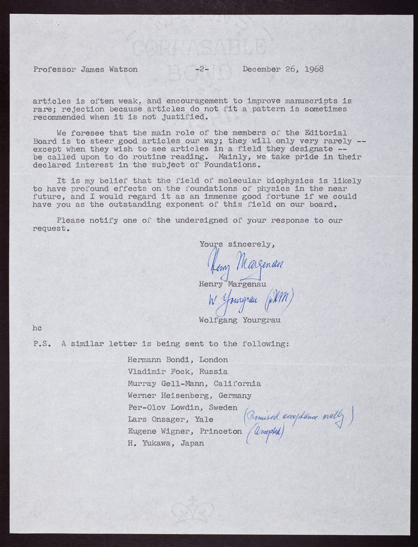 Letter from Henry Margenau and Wolfgang Yourgrau to James D. Watson