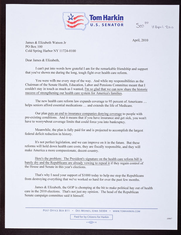 Item JDW/2/2/782: Harkin, Tom (U.S. Senator) (2009-2010)