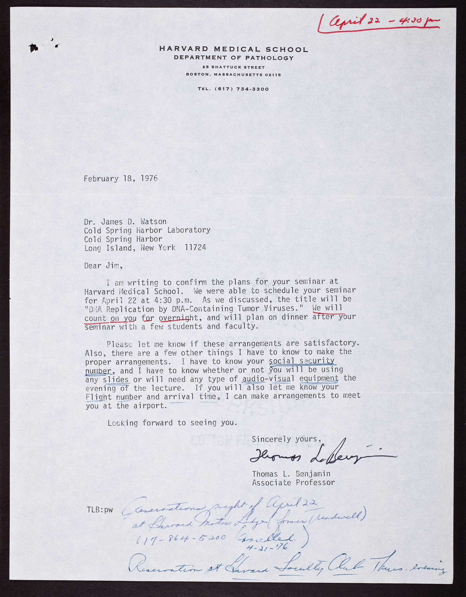 Letter from Thomas Benjamin to James D. Watson