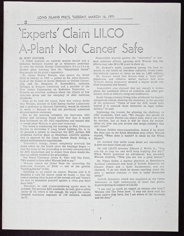 "'Experts' Claim LILCO A-Plant Not Cancer Safe" by Judy Fischer