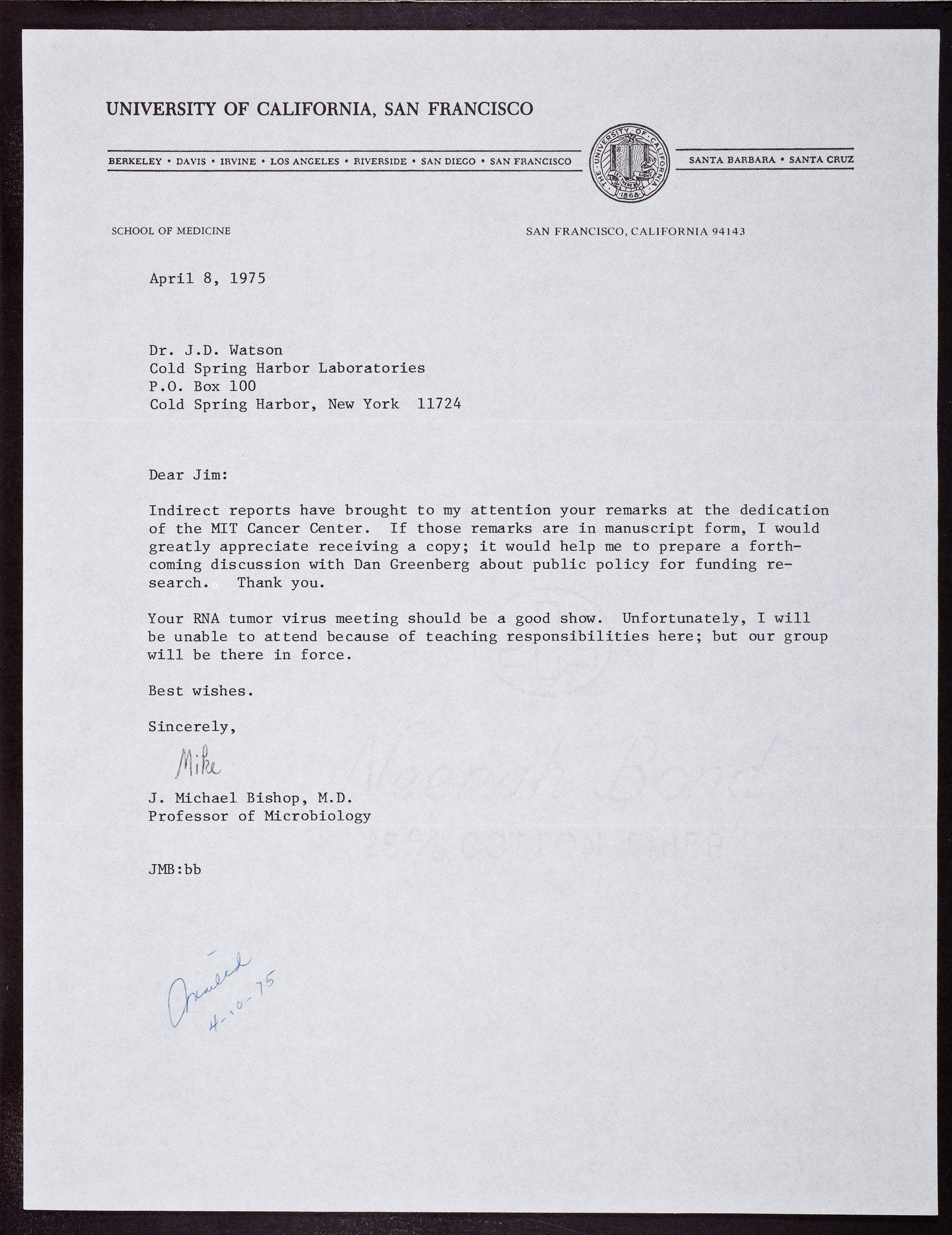 Regarding Watson's speech delivered at MIT on 6 March 1975. See also: Lectures, Speeches, Interview: Speeches (JDW/2/8/1).