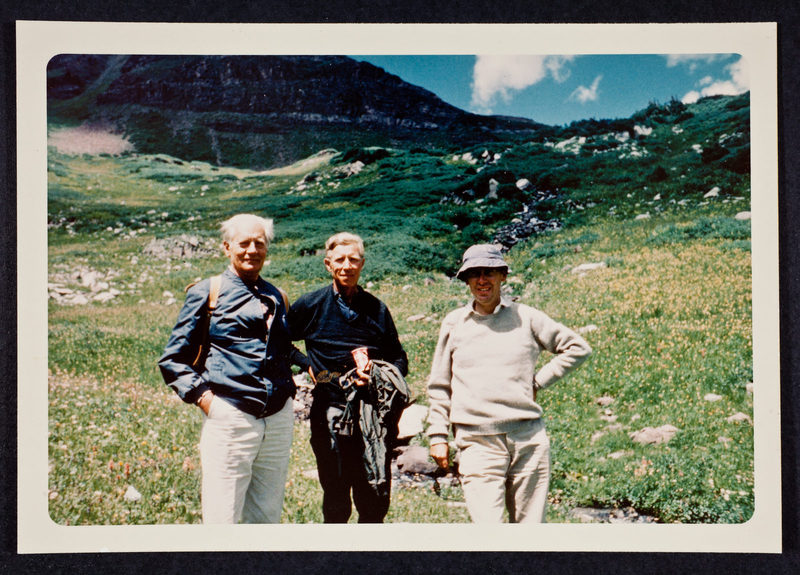 Photograph of Konrad Bloch, Carl Cori, and James D. Watson standing on a mountain.
