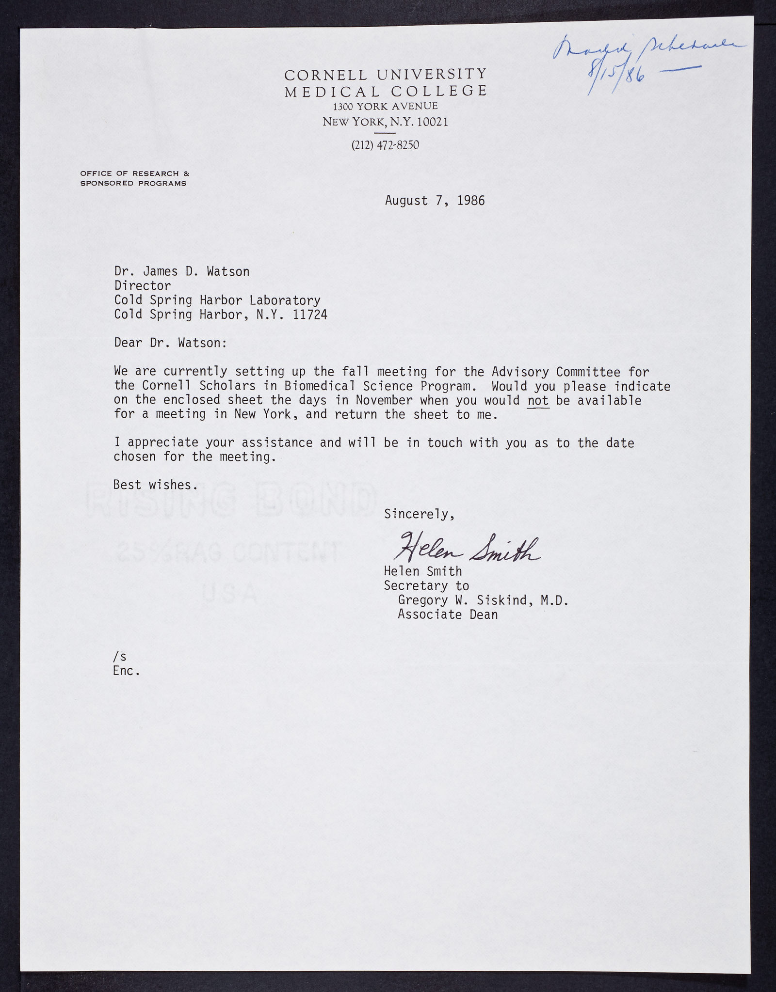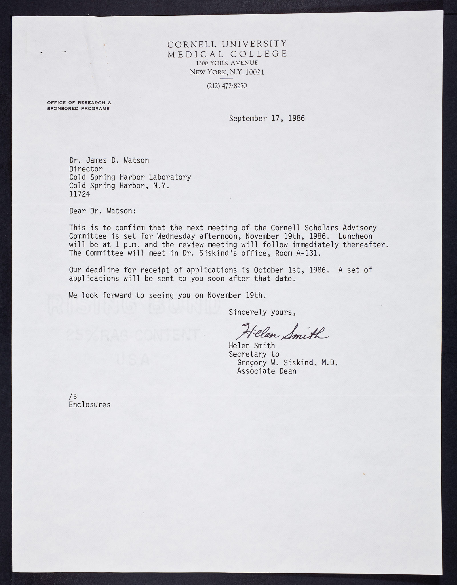 Cornell University Medical School Advisory Committee (19 November 1986)