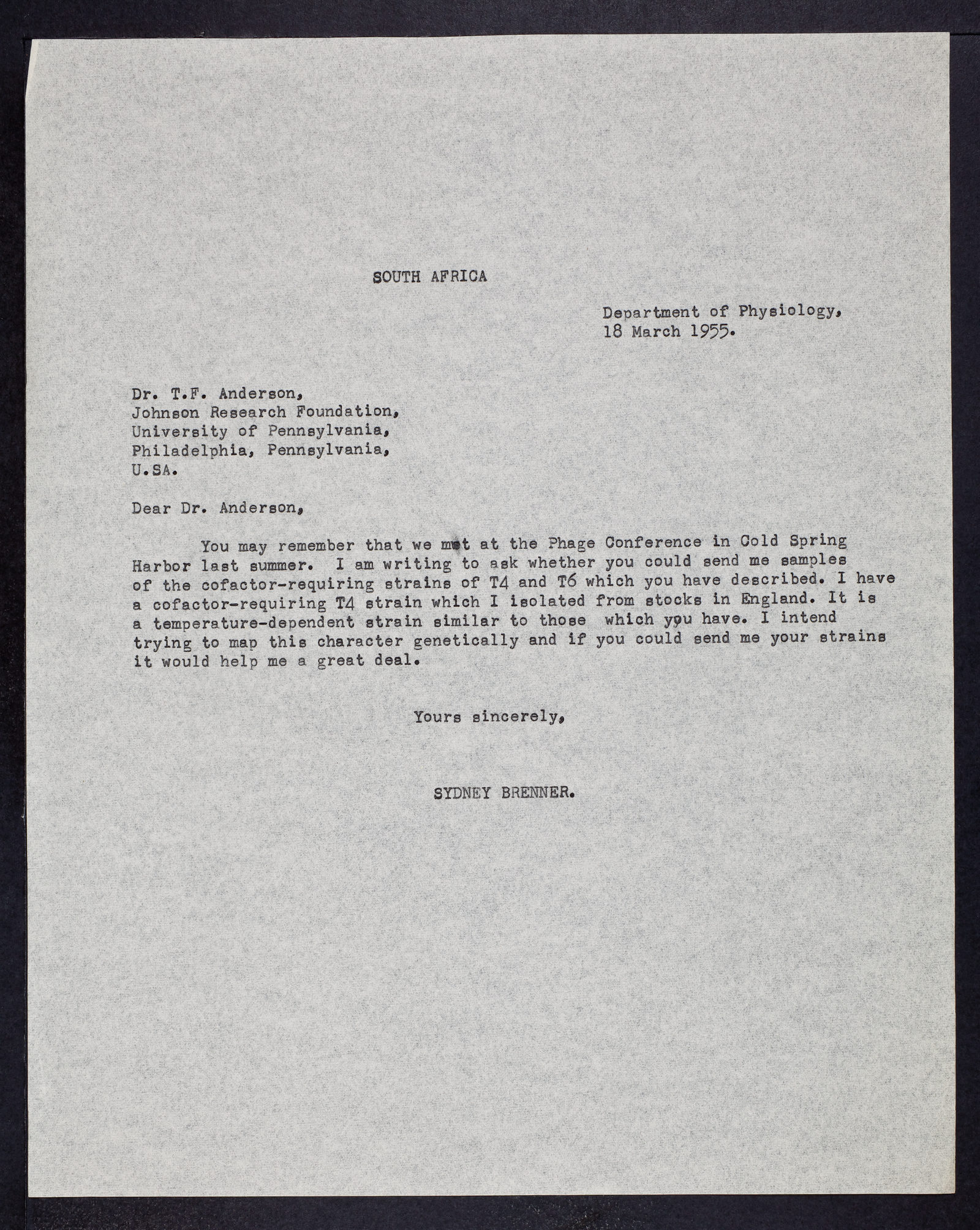 Letter from Sydney Brenner to Thomas F. Anderson