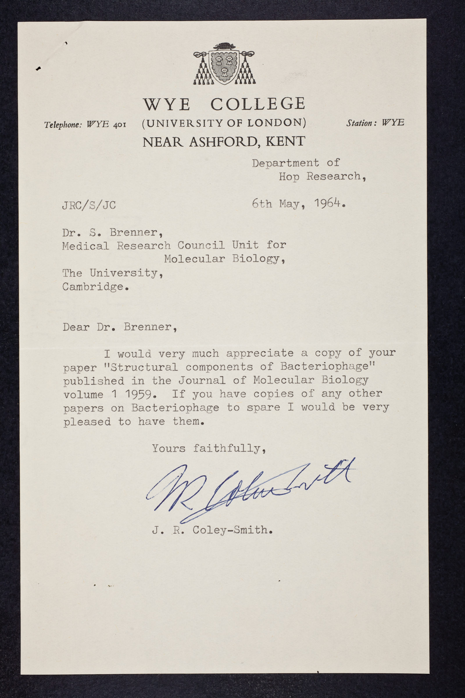 Letter from J.R. Coley-Smith to Sydney Brenner