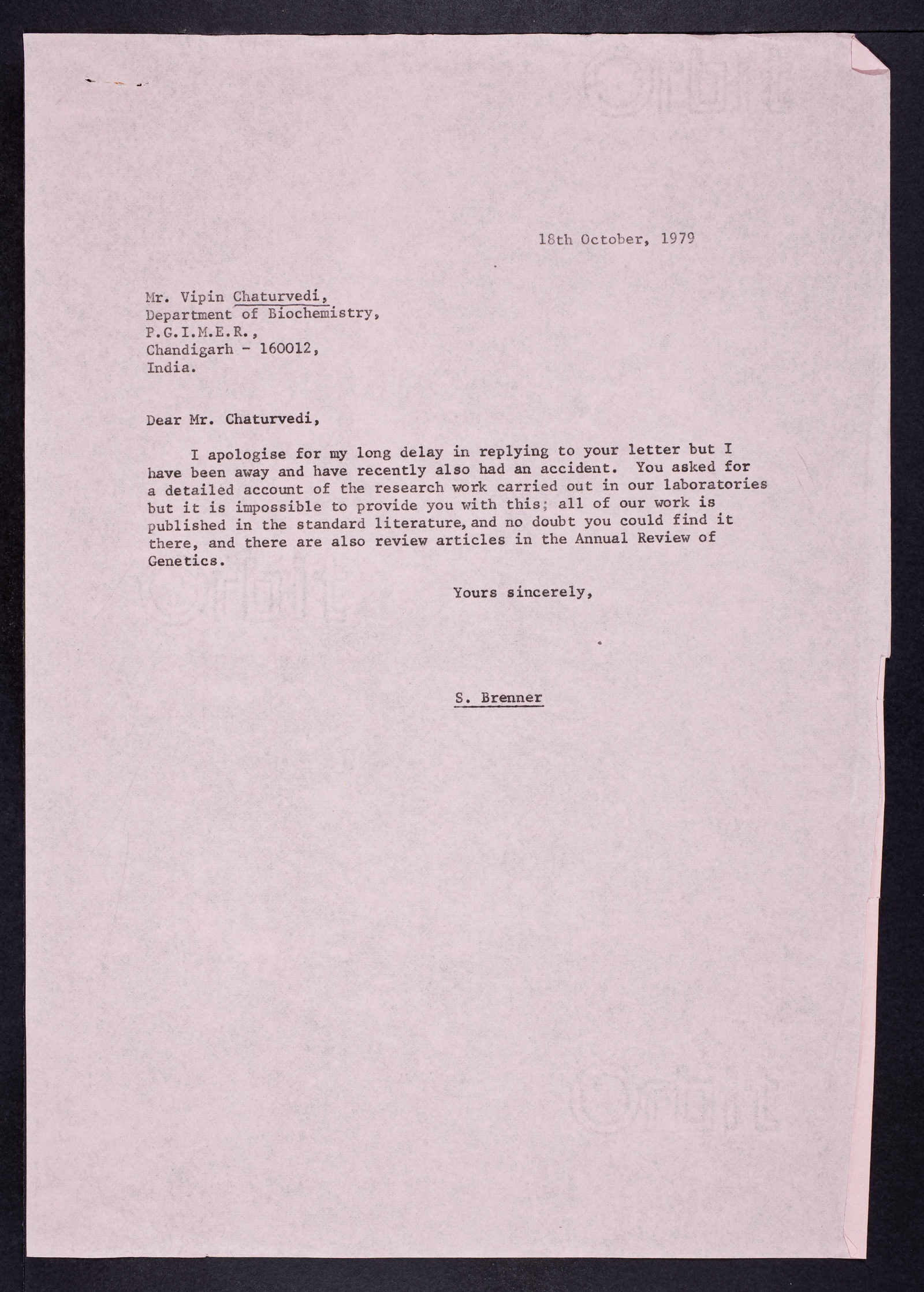 Letter from Sydney Brenner to Vipin Chaturvedi