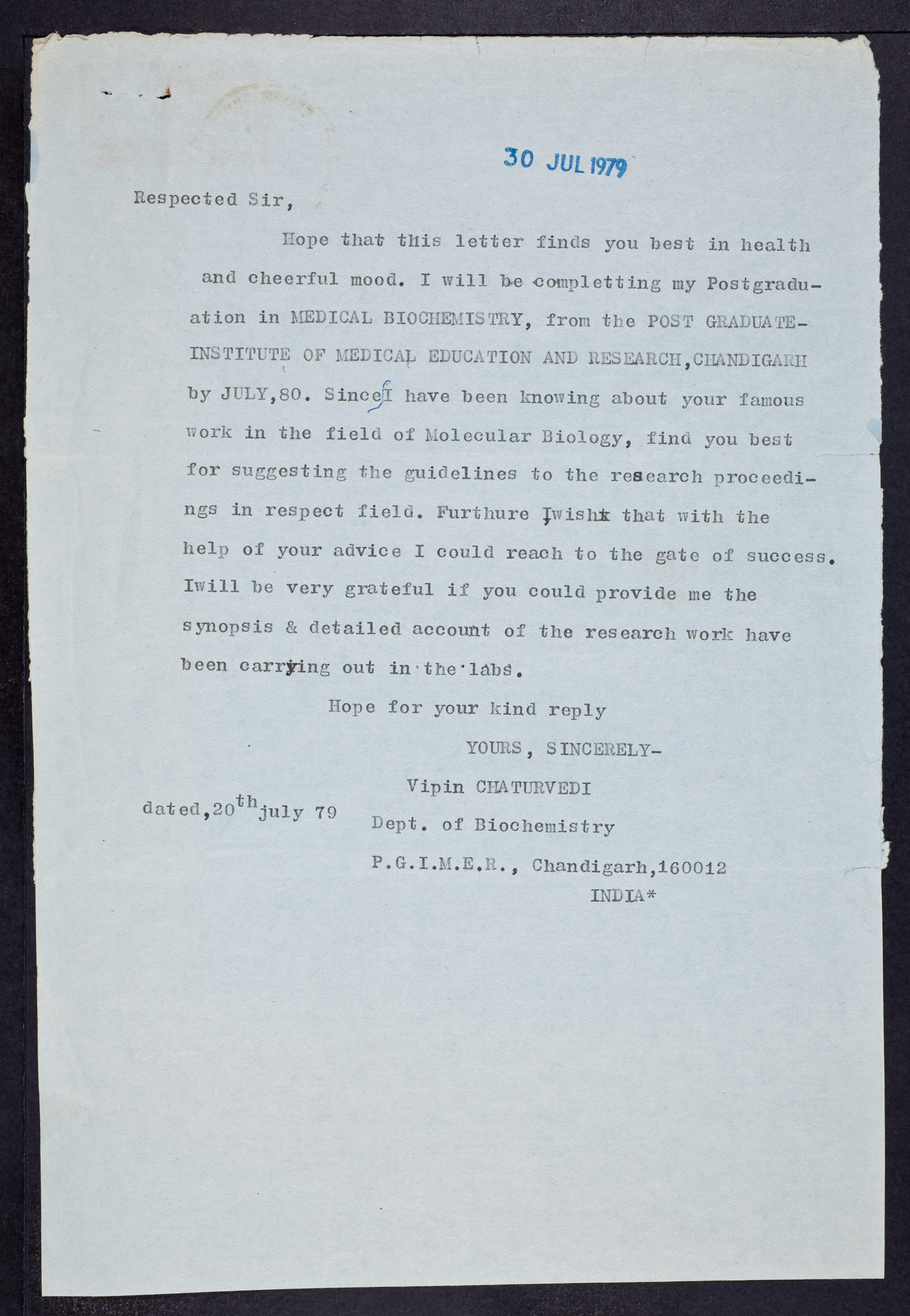 Letter from Vipin Chaturvedi to Sydney Brenner