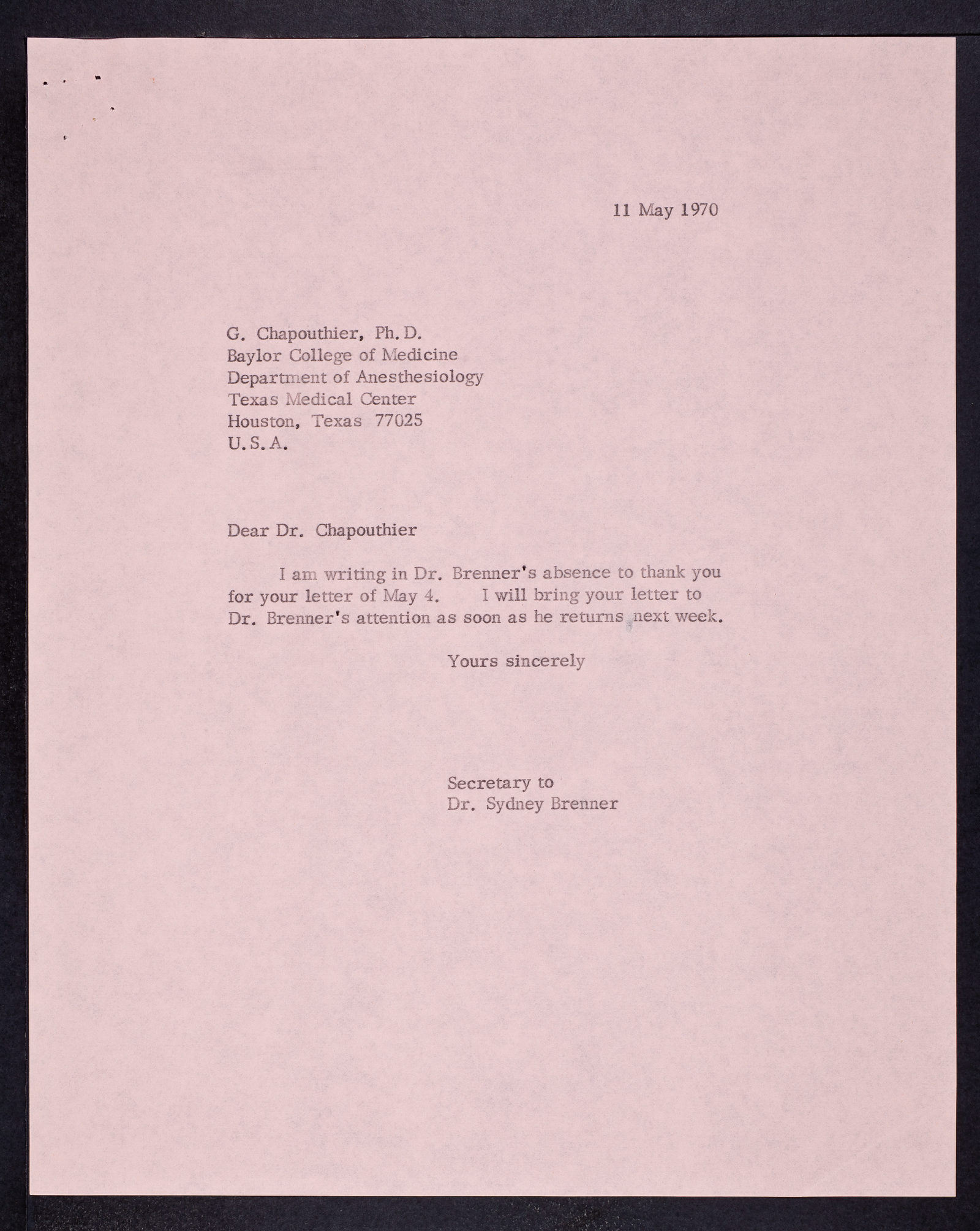 Letter from Sydney Brenner's Secretary to G. Cahpoutheir