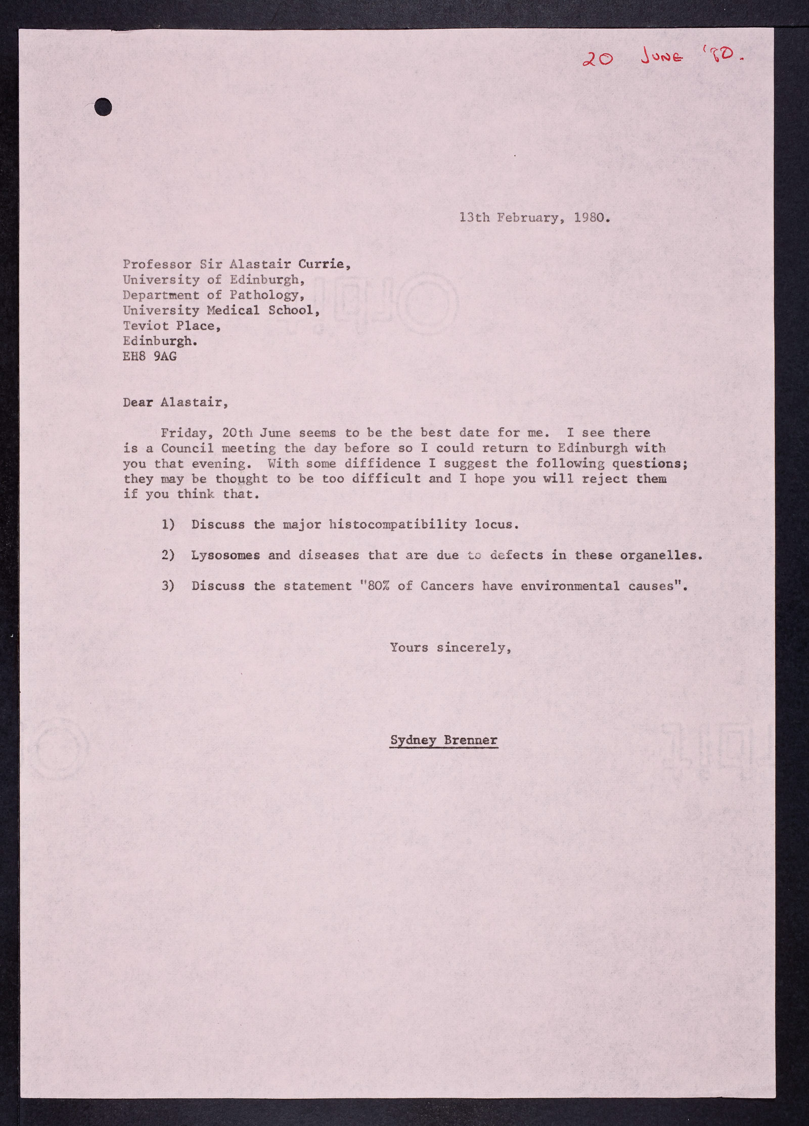 Letter from Sydney Brenner to Alastair R. Currie