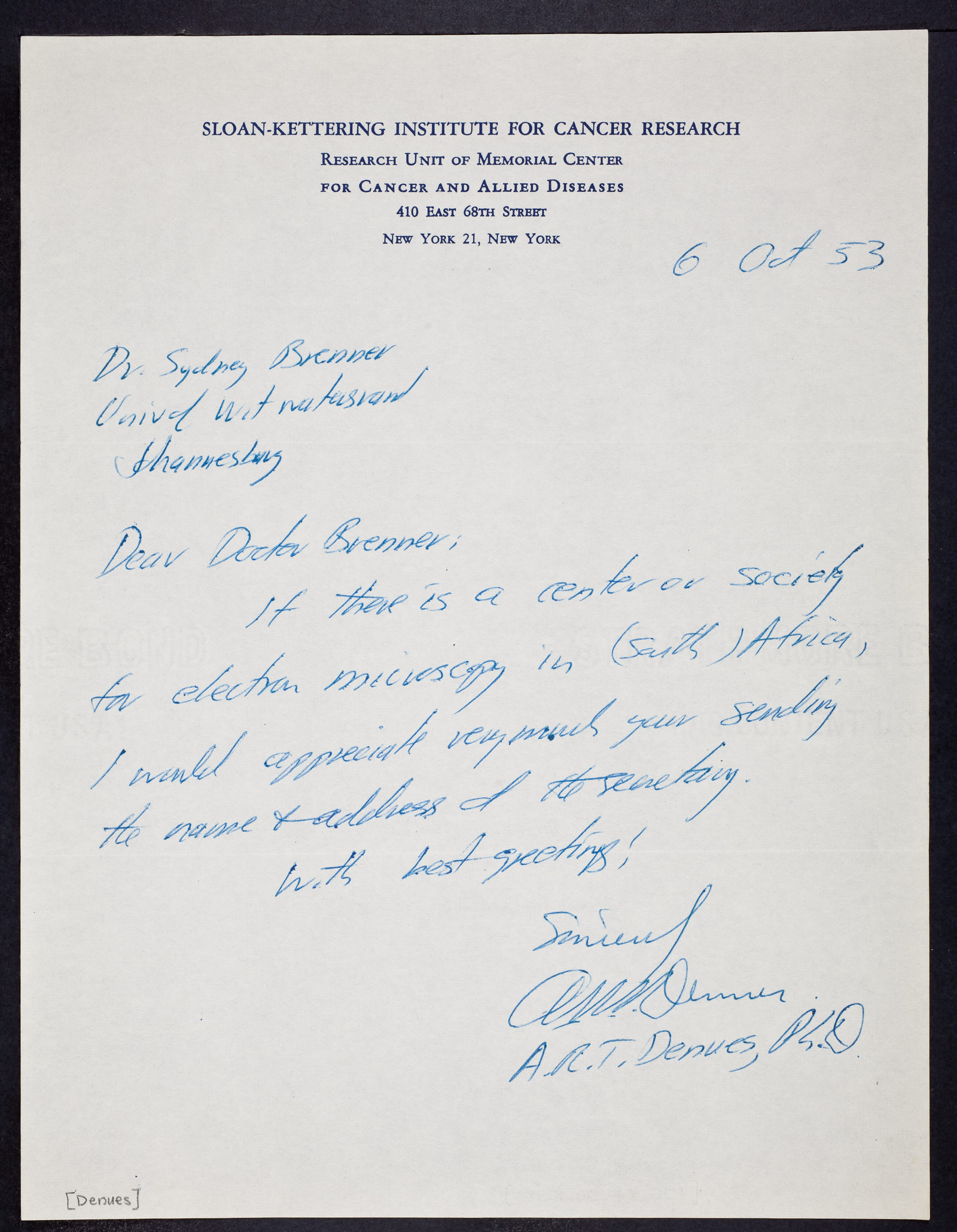 Handwritten letter from A. R. T. Denues to Sydney Brenner