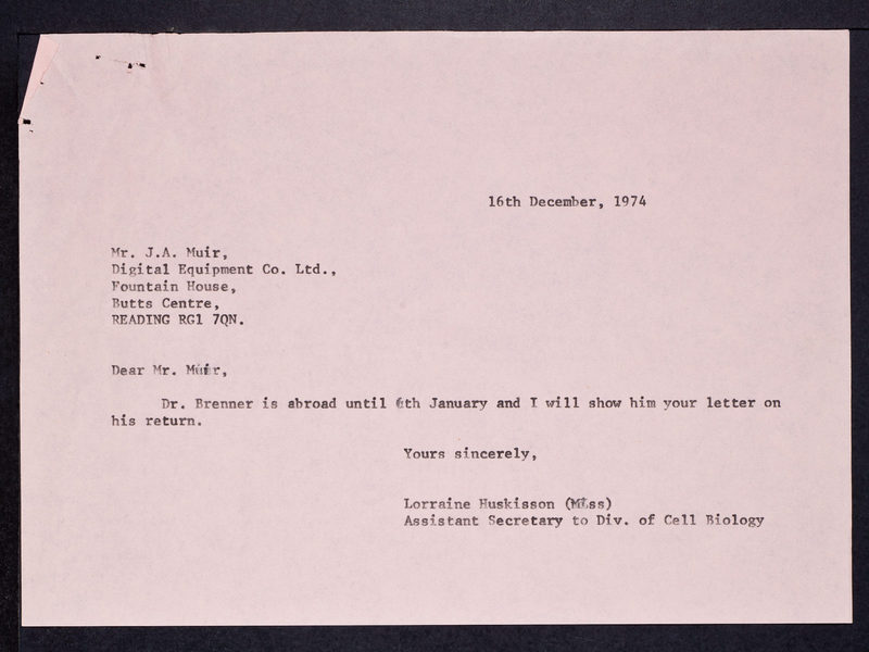 Letter from Lorraine Huskisson, Sydney Brenner's Secretary, to James A. Muir