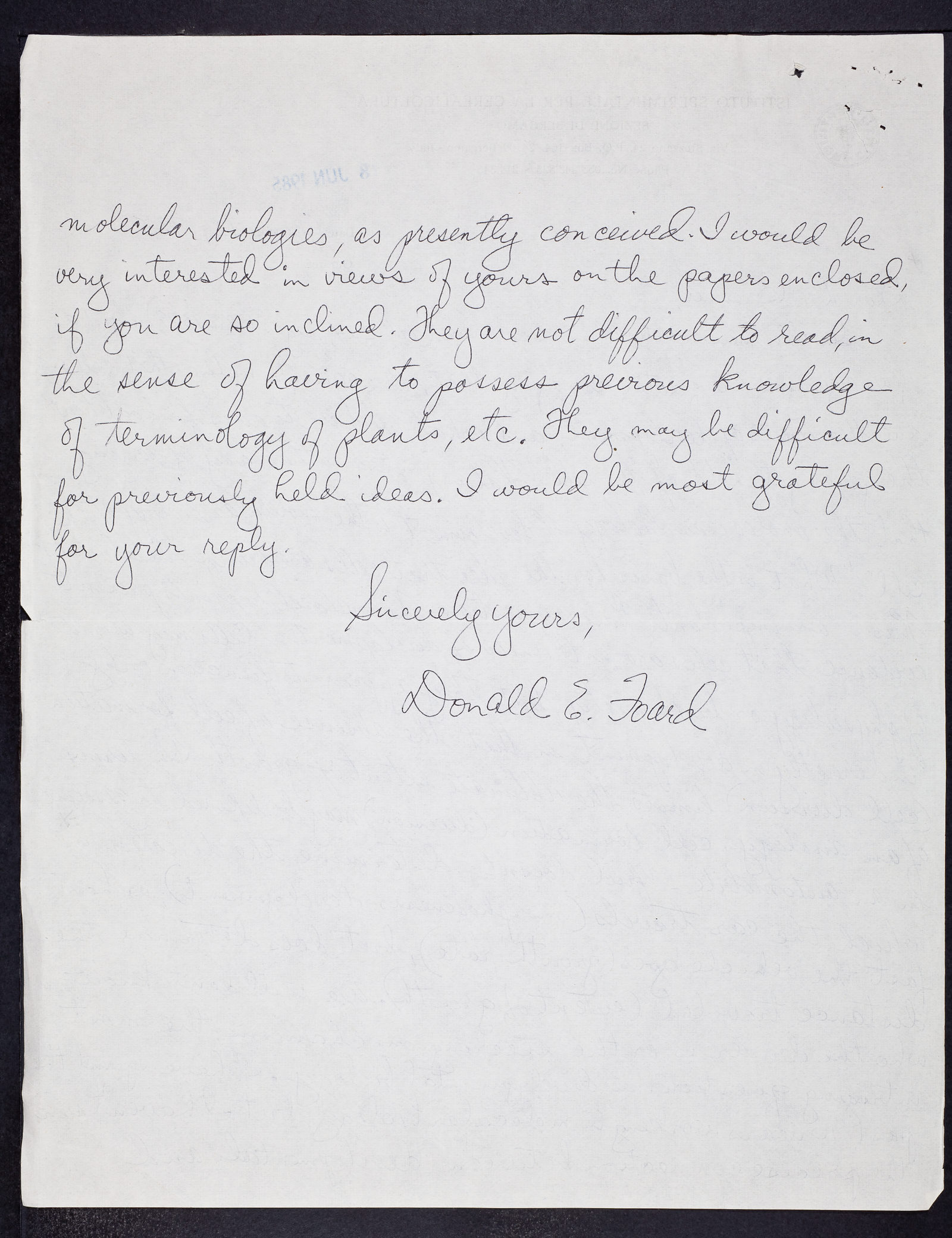 Handwritten letter from Donald E. Foard to Sydney Brenner