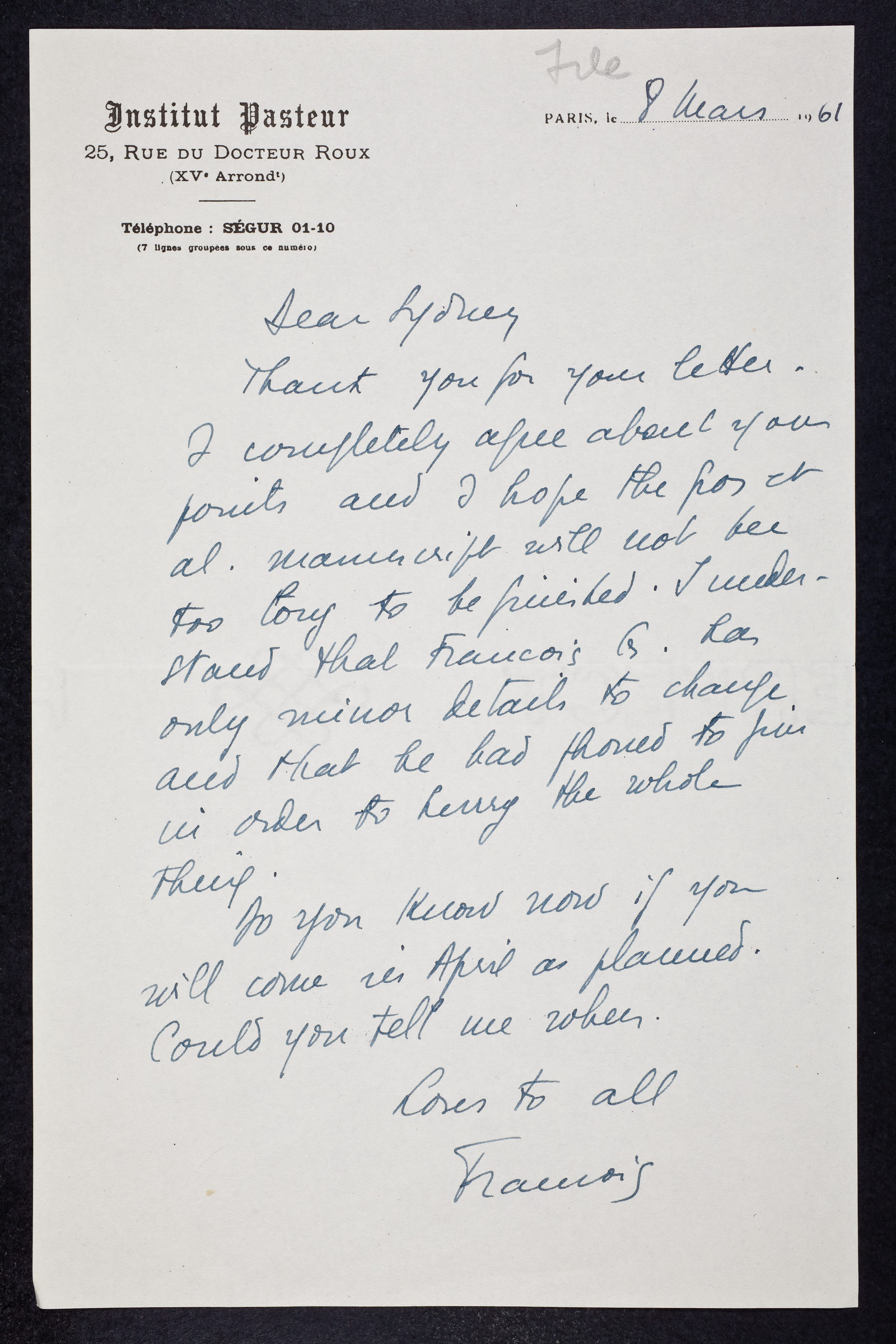 Handwritten letter from Francois Jacob to Sydney Brenner