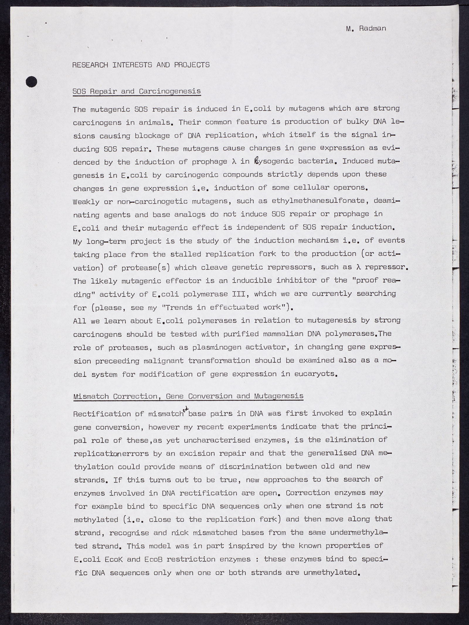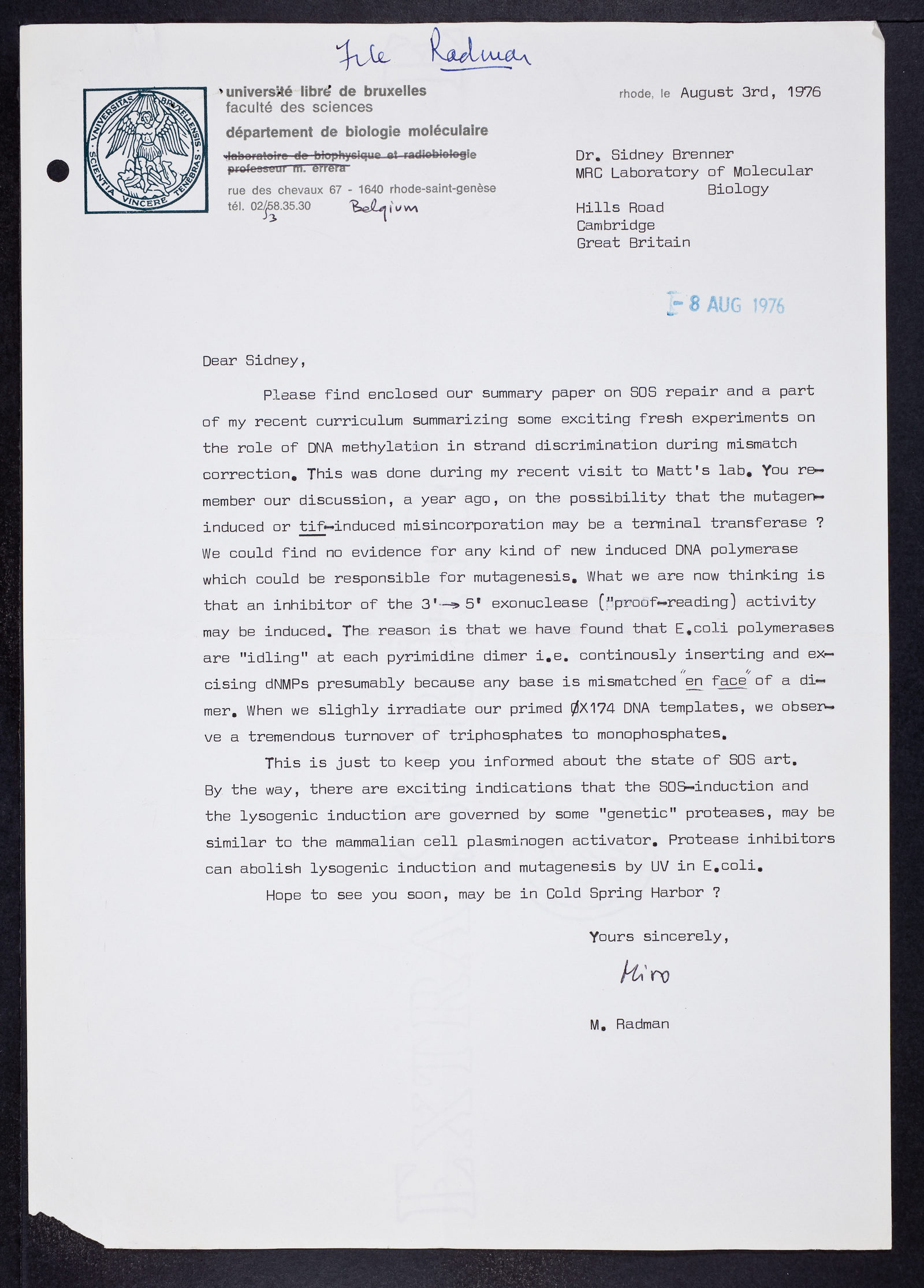 Letter from Miroslav Radman to Sydney Brenner