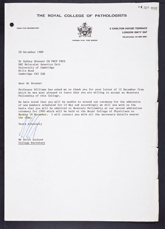 Royal College of Pathologists (See also: Personal Papers - Awards (SB/5/1))