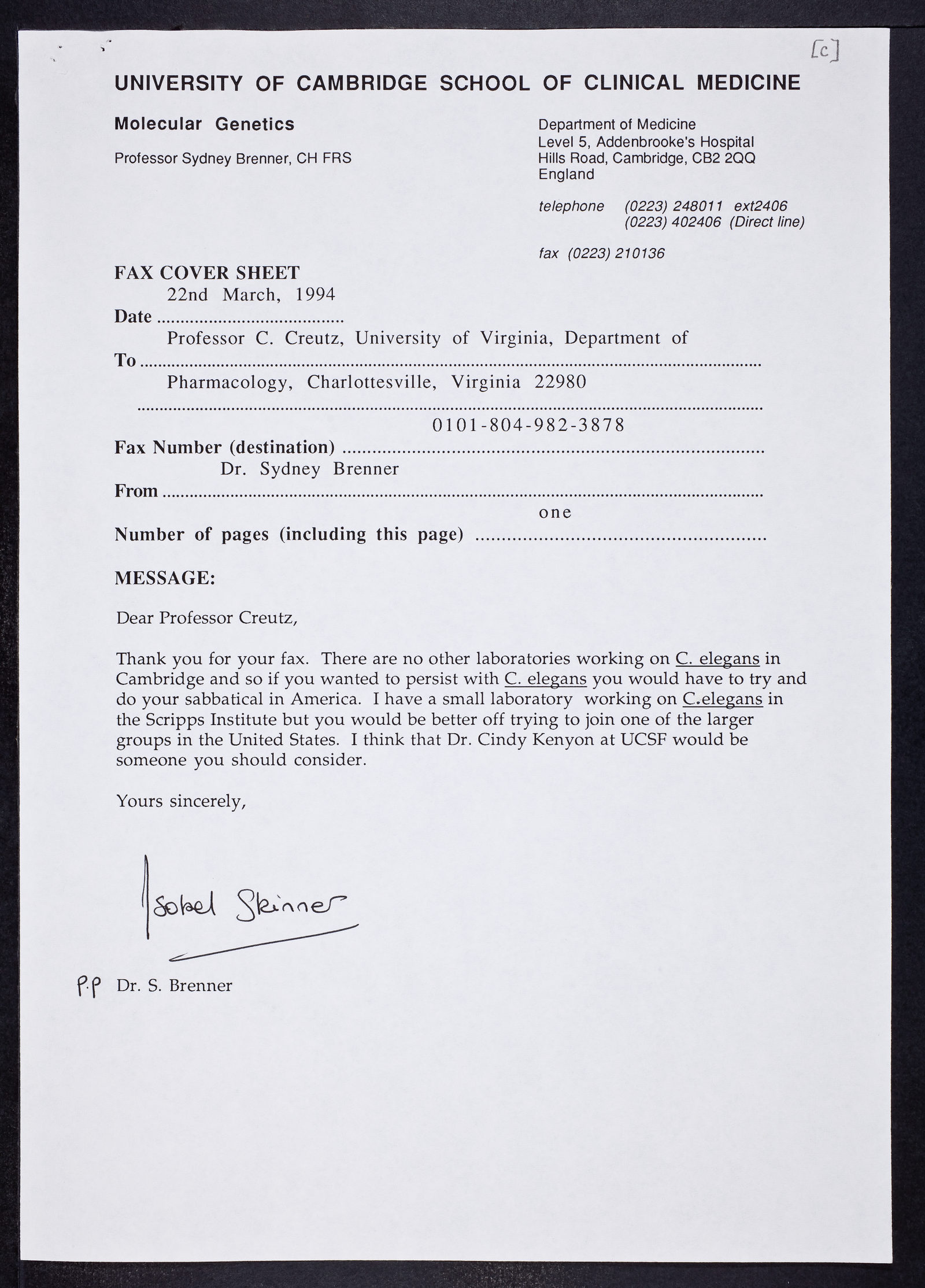 Faxed letter from Sydney Brenner to Carl Cruetz